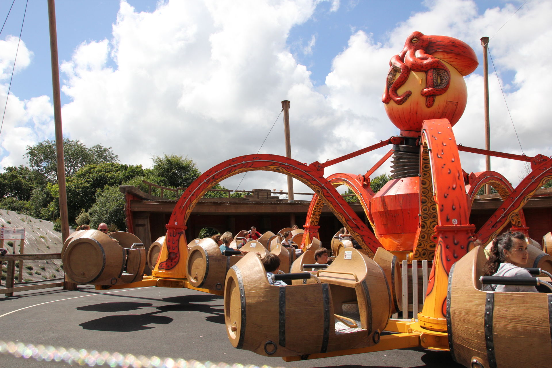 Die Heimat von La Récré des 3 Curés, die französische Bretagne, ist stark maritim geprägt. So ist es kein Wunder, dass in einem bretonischen Freizeitpark auch maritime Attraktionen Einzug halten. Nach den beiden Wasserbahnen, der Piratenschiffschaukel und dem großen Wasserspielplatz folgt im Jahre 2012 nun eine ganz besondere Karussellattraktion für die ganze Familie. "Pieuvre", so der Name, bedeutet auf Deutsch übersetzt "Krake". Und eben jene thront in Mitten eines großen Schiffswracks und wartet nur darauf, mutige und spaßsuchende Piratenbesucher mit ihren Fangarmen zu ergreifen und durch die Luft zu wirbeln. Wer sich nicht bis in den Einflussbereich des Oktopus traut, kann durch die "Kanonenöffnungen" in dem das Fahrgeschäft umgebenden Schiffsrumpf dem Treiben natürlich auch aus sicherer Entfernung beiwohnen.