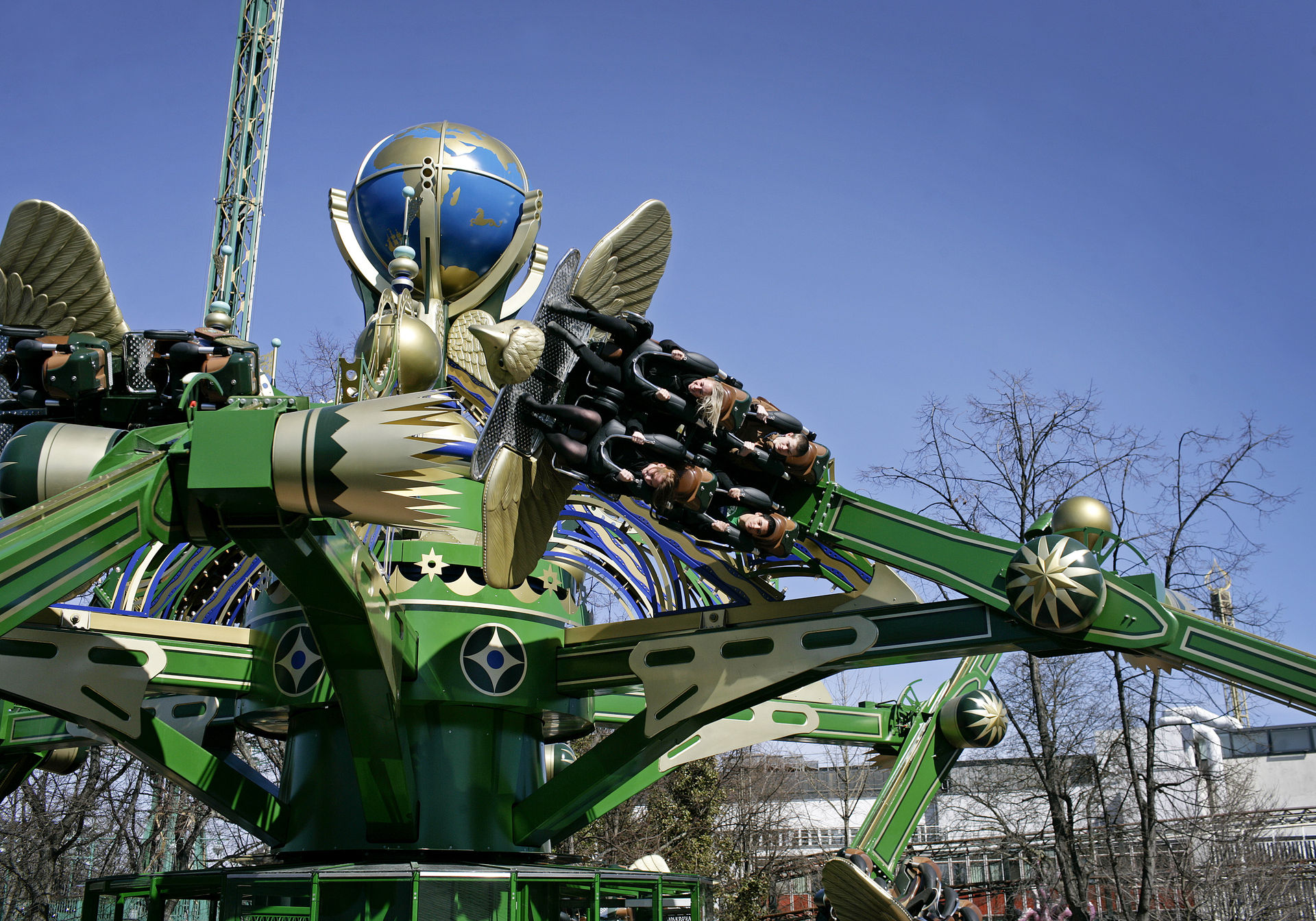 Wie es sich für einen richtigen Freizeitpark gehört, kann man im Tivoli eine Vielzahl an Fahrgeschäften finden. Während einer Fahrt mit dem fast 80 Meter hohen Kettenflieger „Himmelskibet“ kann man die herrliche Aussicht über Kopenhagen und den gesamten Tivoli genießen. Auf ganz mutige Fahrgäste warten die beiden Fahrgeschäfte „Daemonen“ und „Det gyldne Tarn“. Bei einer Fahrt mit der Looping-Achterbahn „Daemonen“ steht man mehrmals auf dem Kopf. Mit atemberaubender Geschwindigkeit fährt die Bahn ihre Strecke ab und reißt ihre Mitfahrer mit sich - und das ohne Boden unter den Füßen! Ohne Boden unter den Füßen erlebt man auch „Det gyldne Tarn“. Bei diesem Freifallturm wird man erst in atemberaubende Höhe geschossen, ehe man wieder im fast freien Fall hinuntersaust. Unten angekommen wird man sanft abgebremst und wieder nach oben geschossen.