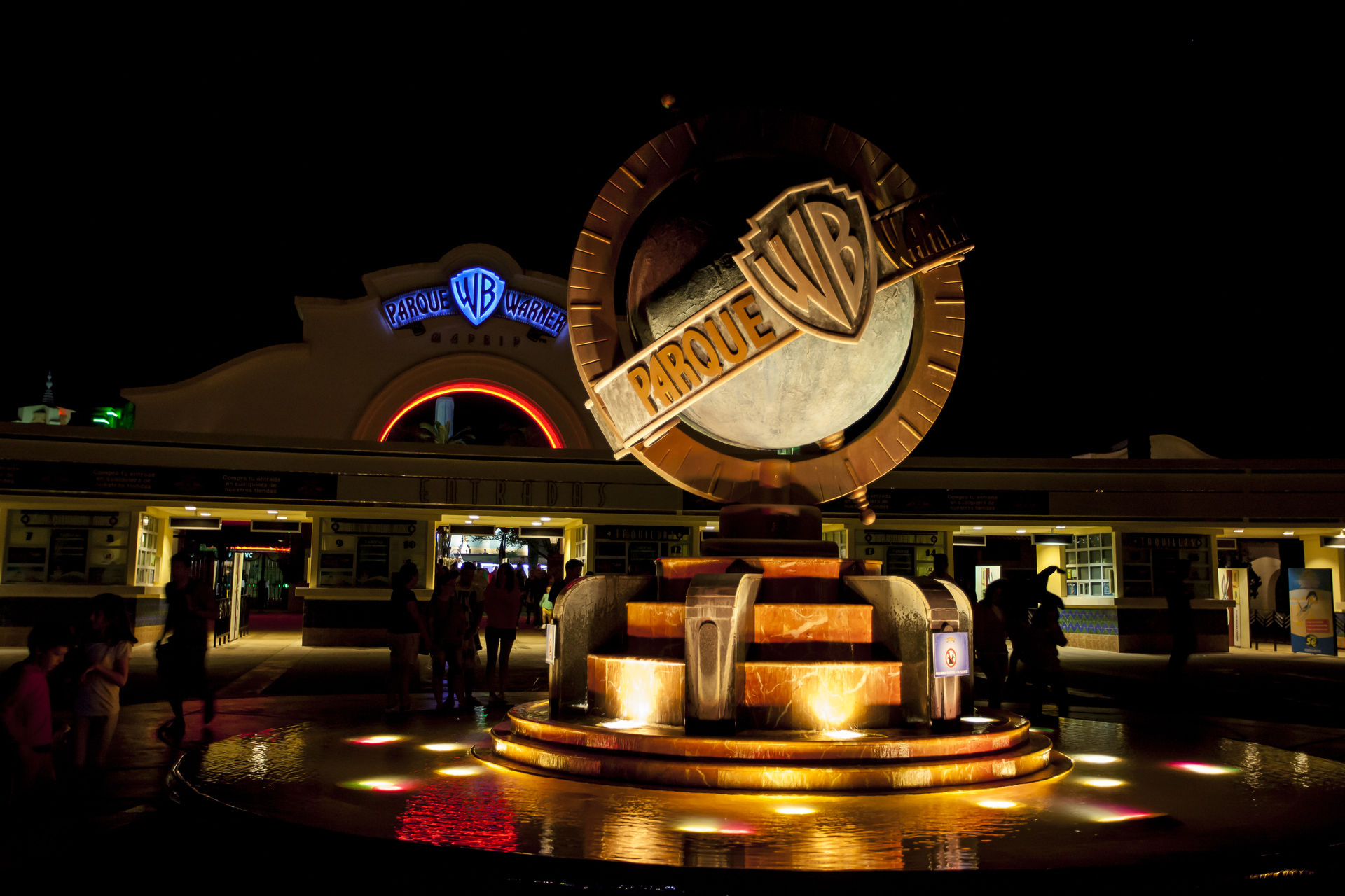 Der Park ist leicht mit der Metro zu erreichen und von der Station Pinto ist es nur eine kurze Busfahrt bis vor das opulente Eingangstor Parque Warners. Vom Parkplatz aus kann man dann auch schon einen schönen Anblick auf eine der Hauptattraktionen des Parks, die Achterbahn "Stunt Fall", erhaschen. Der Haupteingang ist, im Gegensatz zu vielen anderen Parks, auch der einzige Eingang - ein Vorteil, denn die Wegführung ist somit perfekt angepasst und die Orientierung fällt leichter. Hier finden sich auch die einzigen Schließfächer im Park. Hier kann man leicht sein überschüssiges Gepäck verstauen. Angekommen auf dem Hollywood Boulevard kann man die Gelegenheit nutzen, sich in einigen der zahlreichen Shops umzuschauen oder nach der Anreise einfach nur am großen Brunnen zu entspannen.