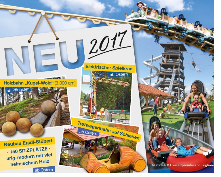 Auch in diesem Jahr wird das Rodel- und Freizeitparadies St. Englmar wieder erweitert. Neu ab Ostern ist die "Tretwagerlbahn", in welcher Kinder in urigen seifenkistenartigen Fahrzeugen im Holzdesign auf einen Rundkurs starten können. Wie der Name der Attraktion es bereits andeutet, muss das Fahrzeug aus eigener Kraft per Pedes angetrieben werden. Ebenfalls für Kinder gibt es ab Ostern den neuen elektrischen Spielkran. Dank mehrerer Meter Höhe, kann hier jedes Kind im Handumdrehen einen großen Baustellenkran steuern. Die Eltern können derweil im benachbarten neuerrichteten Egidi-Stüberl auf einem der 150 Sitzplätze Platz nehmen und etwas trinken oder essen. Als vierte und letzte Neuheit wird am Hang des Berges, welcher auch u. a. für die Sommerrodelbahn genutzt wird, eine überdimensional große Holzkugelbahn namens "Kugel-Woid" errichtet. Diese wird ab Pfingsten einsatzbereit sein.