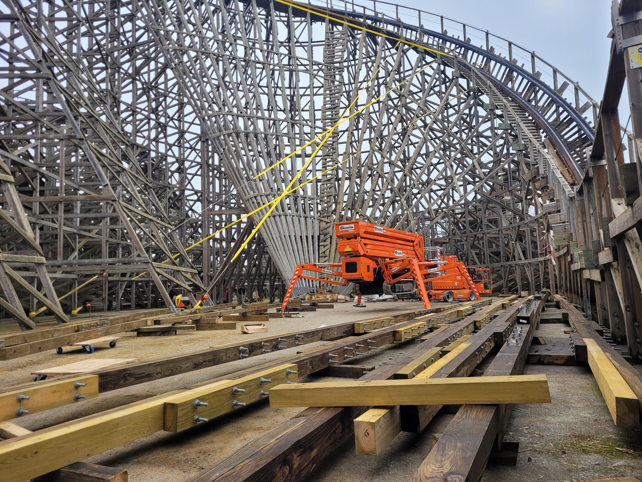Bei 0:40 erkennt man an der linken Schiene schön den Farbübergang von oben (grün-bräunlich) nach unten (rötlich) der obersten beiden Schichten. Beide Bereiche sind ausgetauscht. Im oberen bereich (grün-bräunlich) verwenden sie "normales" Holz (imprägnierte Kiefer). Im unteren Bereich (rötlich), wo die Belastungen höher sind, verwendet Great Coasters schon seit einiger Zeit, nicht nur bei Retrackings, sondern auch bei neuen Bahnen, richtig massives Hartholz (Tropenholz, Ironwood). Man erhofft sich dadurch eine wesentlich längere Lebensdauer der Schiene. Nachteil ist, dass sich das Zeug sehr schlecht verarbeiten lässt. Für jeden Nagel muss das Holz nämlich zuerst vorgebohrt werden.