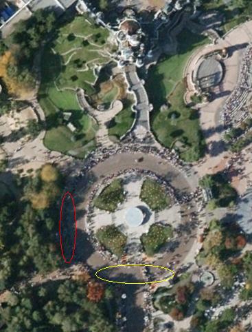Gerade fiel mir zudem noch ein, dass wohl am Wochenende das tägliche Feuerwerk wieder startet. Zuvor gibt es zudem noch die Nacht-Parade. Wir haben die Erfahrung gemacht, dass der rot eingekreiste Bereich sehr gut für die Parade ist, da die Wagen mehrmals stehen bleiben und eine kurze Showeinlage geboten wird. In diesem Bereich konnte man zumindest mehrere Wagen gleichzeitig sehen. Die gelbe Elipse eignet sich danach sehr gut um das Feuerwerk anschauen zu können.