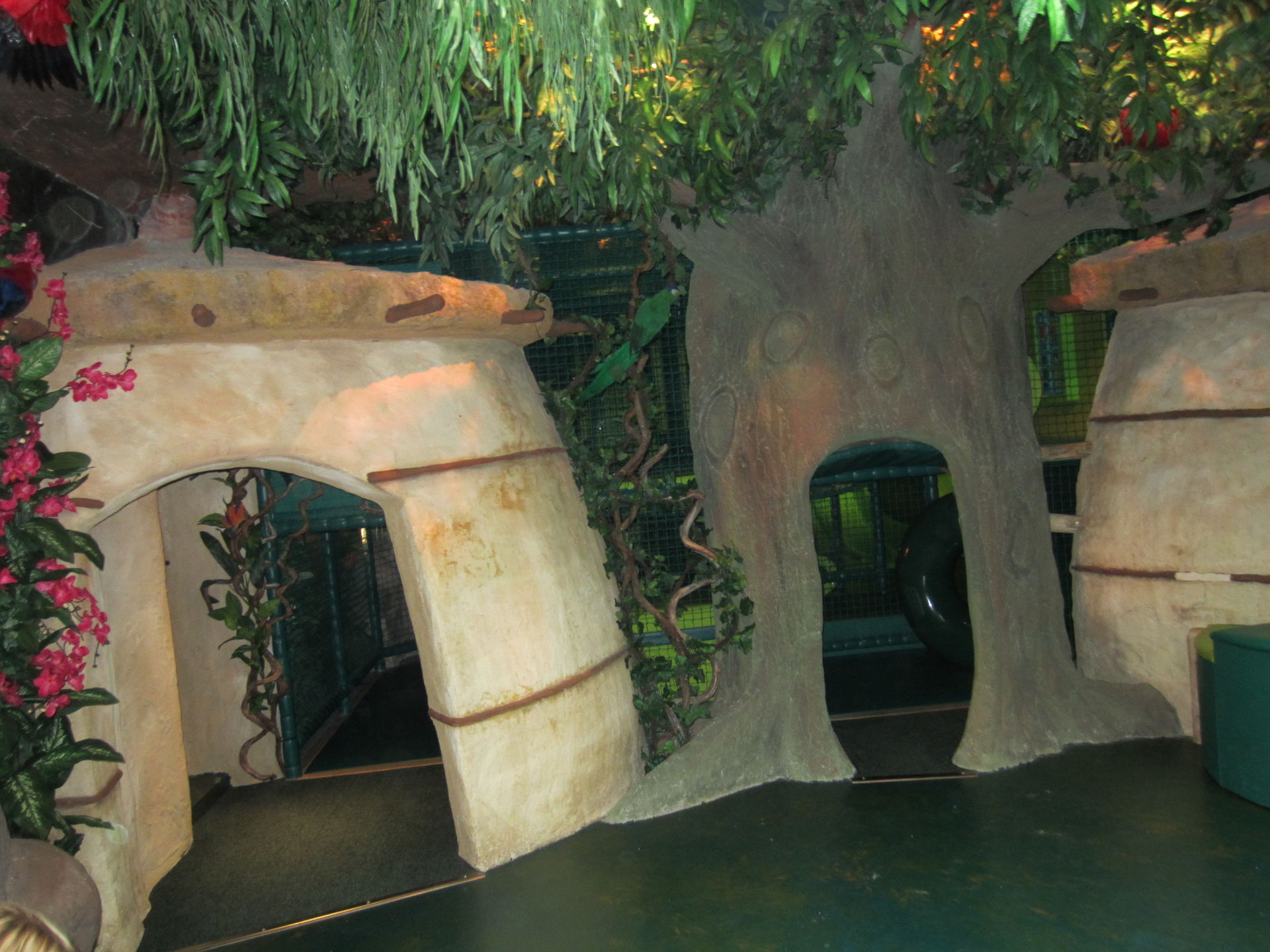 In einem Vorraum stehen diese Lehmhütten, durch die man zum eigentlichen Spielplatz kommt