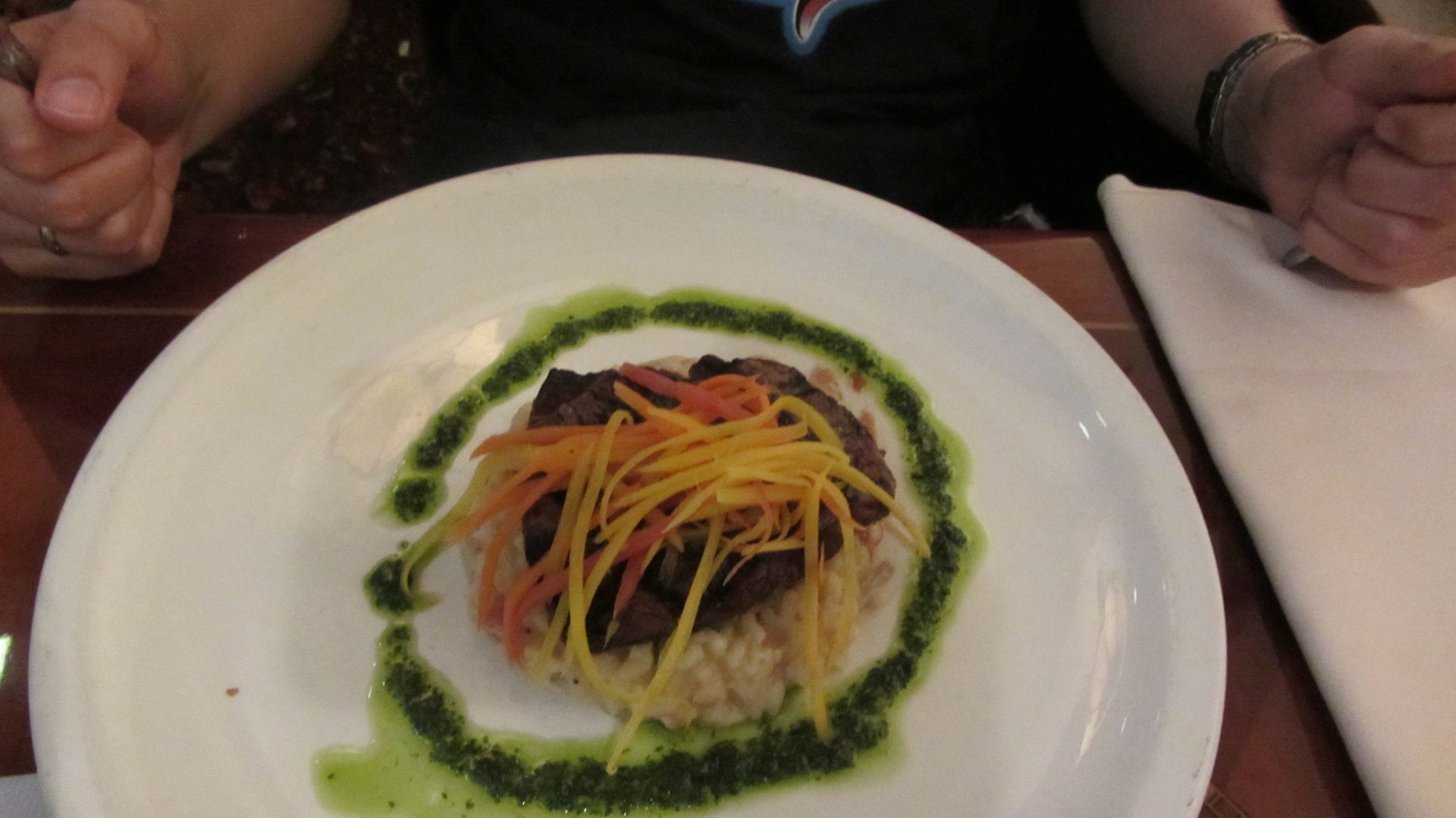 Chared Filet of Beef - over Brentwood corn and Pancetta Risotto, arugula peston and pickeled rainbow chard