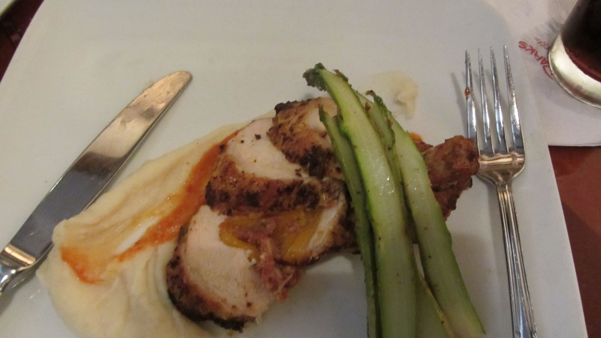 Roasted Free-range Ashley Farms Breast of Chicken - stuffed with sweet pepper, chorizo, and smoked cheddar cheese over a celery root puree. Corinader dusted asparagus and a roasted red papper sauce
