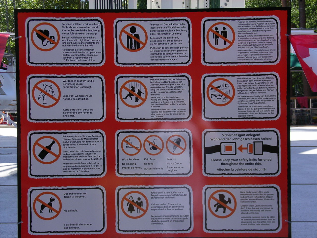 In der anschließenden Diskussion versuchte ich dem Personal zu erklären, daß mit Sportbrille und zusätzlichem Sicherungsband auf der EGF gefahren werden darf. Als Erklärung bekam ich zur Antwort, der TÜV hätte alles verboten, was runterfallen könnte. Ich sollte das mit der Parkleitung abklären.