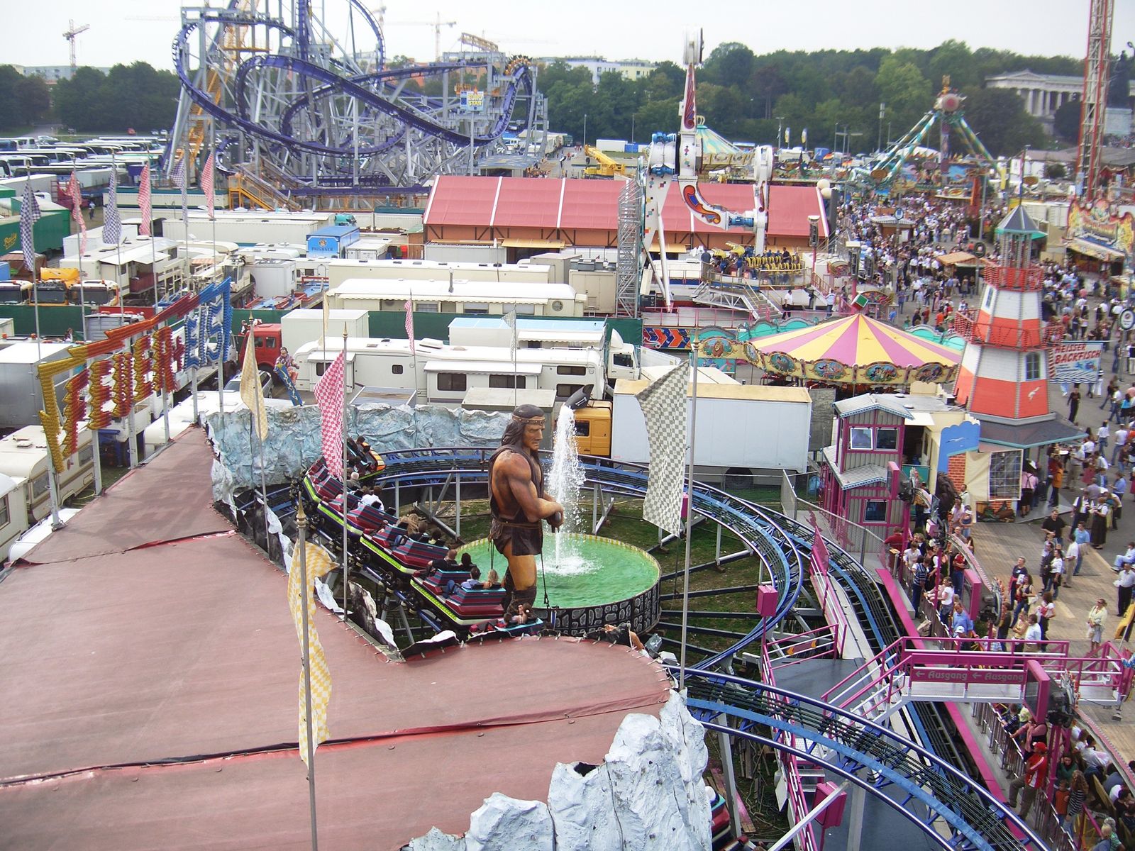 Gestern fuhr ich nach München zum Oktoberfest. Nach 3 1/2 Stunden Zugfahrt inklusive einer halben Stunde Verspätung, weil sich manche schon im Zug die Kante geben mussten, sodas der ICE unplanmäßig auf Grund eines Notarzteinsatzes halten musste S, kam ich in München an. Weiter gings mit der völlig überfüllten U4 zur Theresienwiese. Bevor es um 12 Uhr richtig los ging, lief ich schonmal über den Platz. Die Bebauung finde ich besser als letztes Jahr. Nur eines sollte man vielleicht nächstes Jahr besser machen: Nicht nur im mittleren und vorderen Teil der Theresienwiese (vom Haupteingang aus gesehen) Laufgeschäfte platzieren, sondern auch hinten. Die Beschickung ist wie immer Top, nur "Tropical Trip" von Agtsch habe ich vermisst.