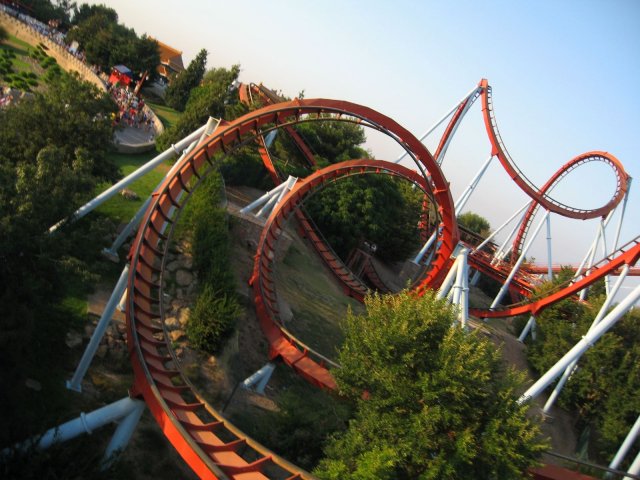 Naja, zurück zum ersten Tag: Nach ca. 90 Minuten saß ich dann in der letzten Reihe, und zum Glück auf einem Sitz in der Mitte (dazu später mehr). Los gings, aber erstmal etwas ruhiger, und zwar mit der Preshow. Ein Professor erscheint oben auf den Monitoren und schraubt an einer Maschine rum. Daraufhin erscheint ein Äffchen, betätigt einen Hebel. Der Professor 'fliegt' weg, durch irgendwelche Röhren, bis er dann über dem Zug auftaucht. Erst wird der Professor durch eine Röhre voller Wein 'abgeschossen' und kurz darauf der Zug. Der Launch ist nicht gerade gebaut, sondern führt leicht steigend hoch. Nach dem Launch folgt ein kleiner Drop, der hinten für ordentlich Airtime sorgt. Daraufhin fährt man eine laaaanggezogene Kurve durch eine Schlucht. Drei schnelle Richtungswechsel folgen darauf, bis man schließlich in die 'Rolle' gelangt (bitte nennt mir den Fachbegriff). Danach gehts noch einmal kurz über den See und letztendlich in die Bremse.