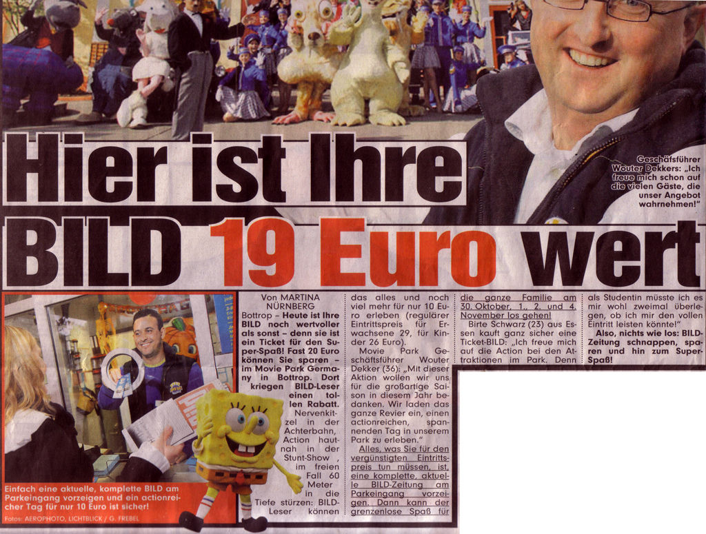 Der Movie Park Bottrop und die BILD-Zeitung bieten eine Aktion, mit der man für nur 10 € in den Movie Park kann und zwar noch heute sowie am 01., 02. und 04. November, sofern man eine aktuelle BILD-Zeitung an der Kasse vorzeigt.