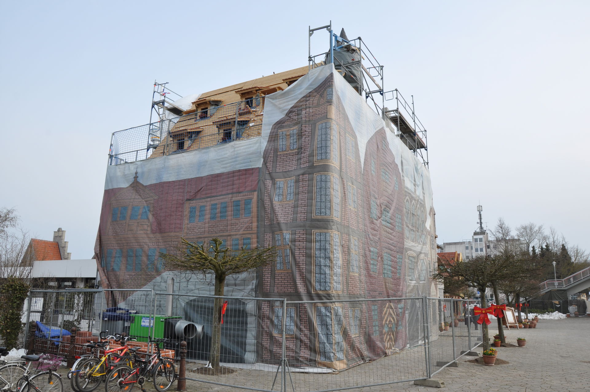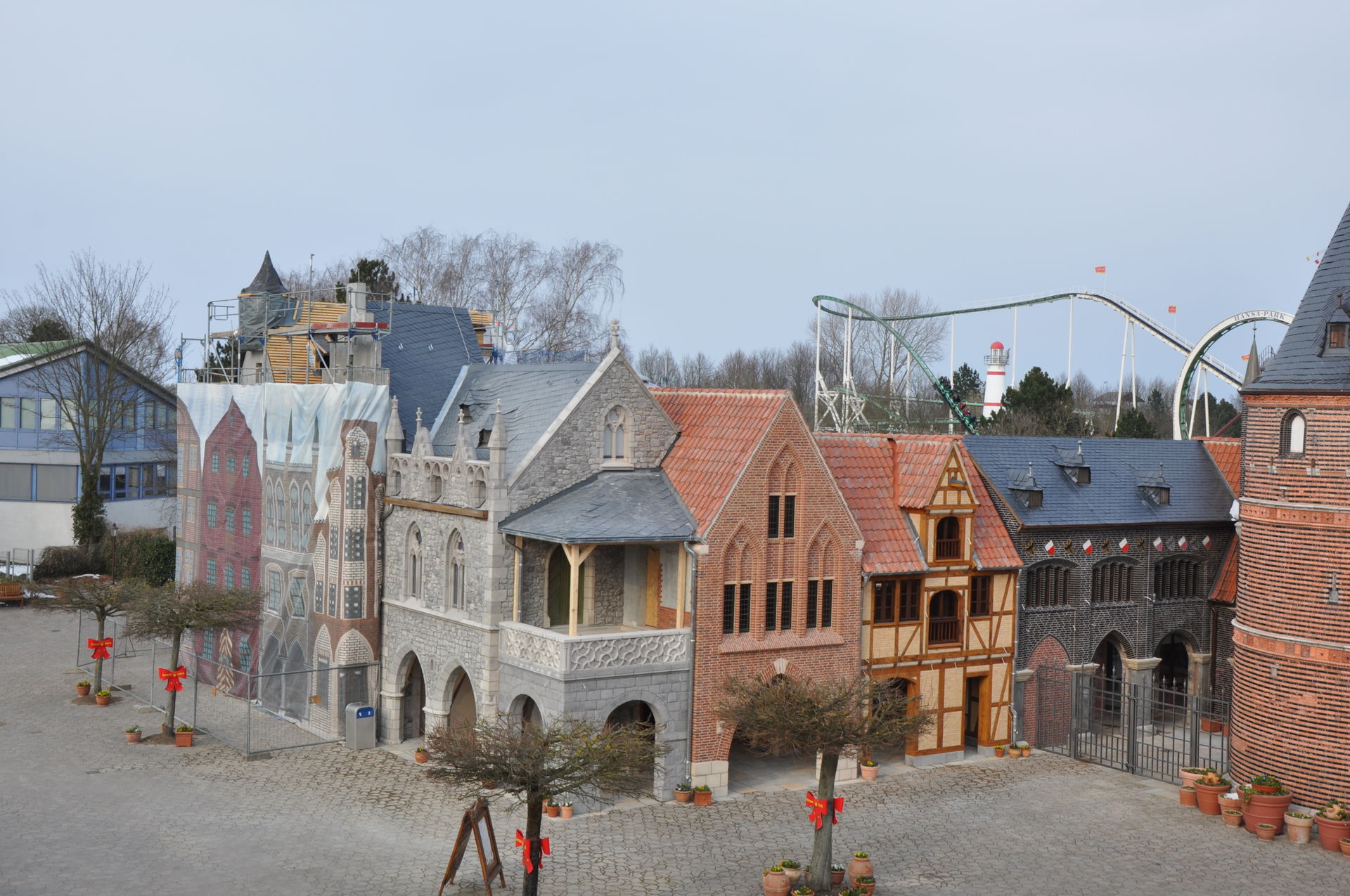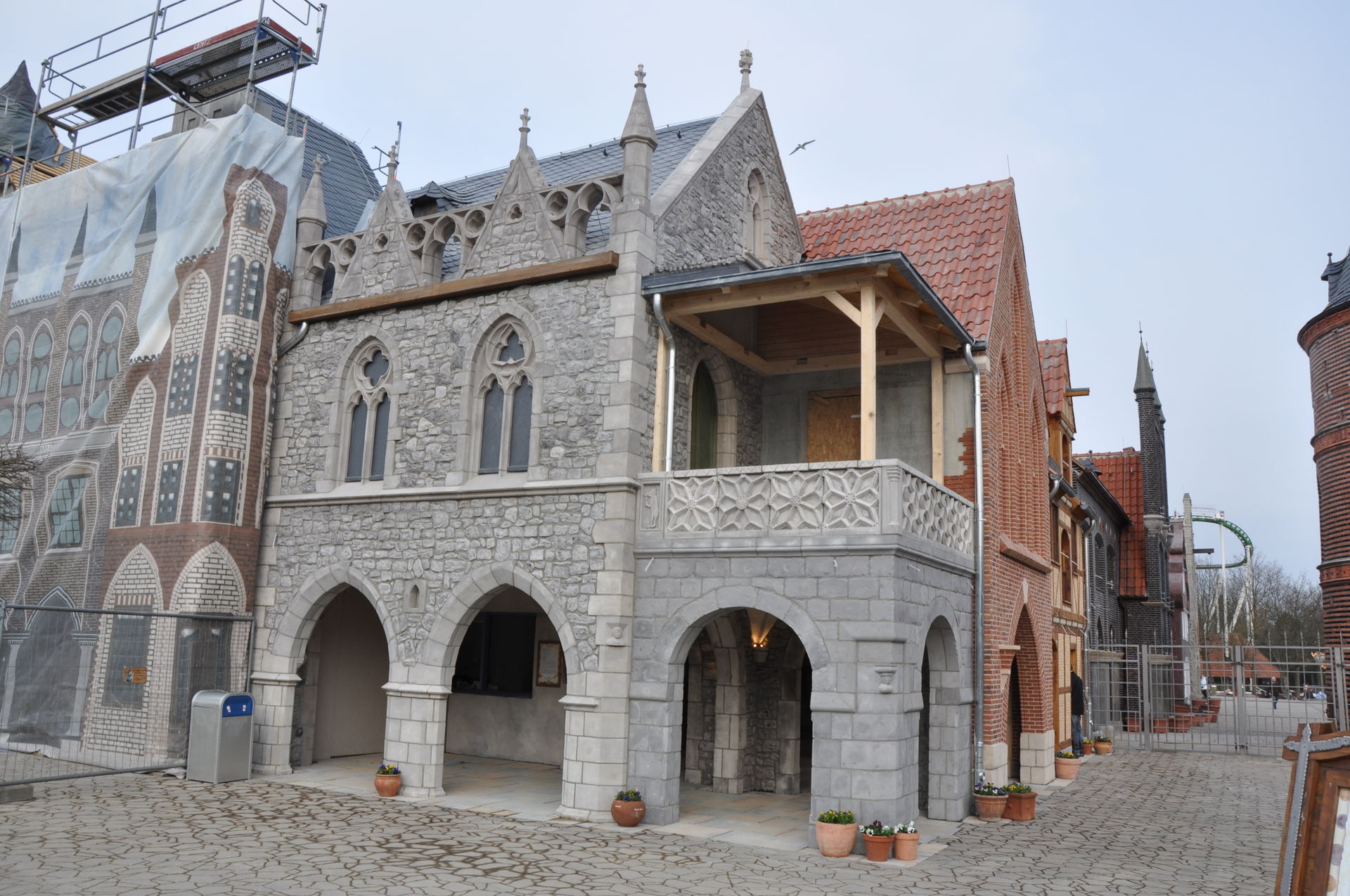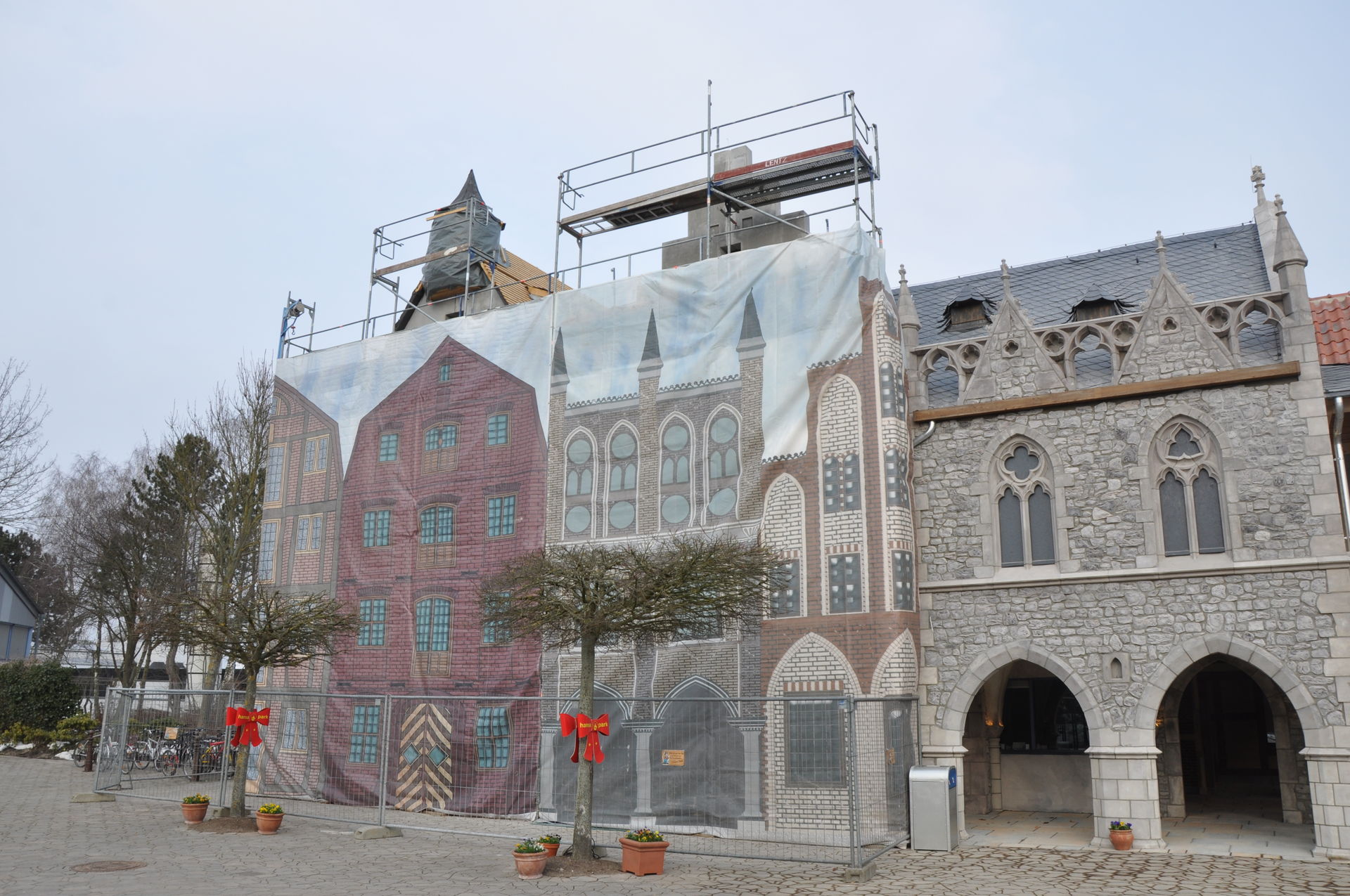 Erweiterung der Hanse-Themenwelt links vom Holstentor. Die Gebäude an den Kassen sind bereits fertig. An den Gebäuden Richtung Verwaltung und Fahrradständer wird noch gearbeitet.