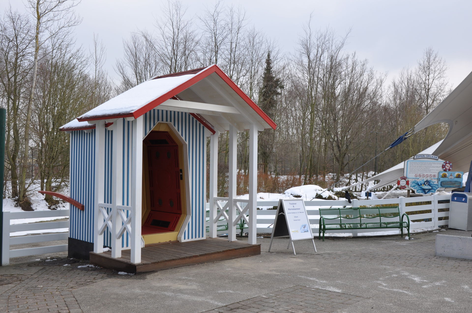 Im Bereich des Super-Splash war noch nichts von dem Schiff zu sehen. Da der gesamte Bereich dicht an der Straße liegt, kann ich mir vorstellen, dass das Schiff irgendwann komplett auf einem LKW kommt und mit einem Kran an Ort und Stelle gebracht wird. Ob es den großen Fön schon in der letzten Saison gab, kann ich nicht mehr sagen.