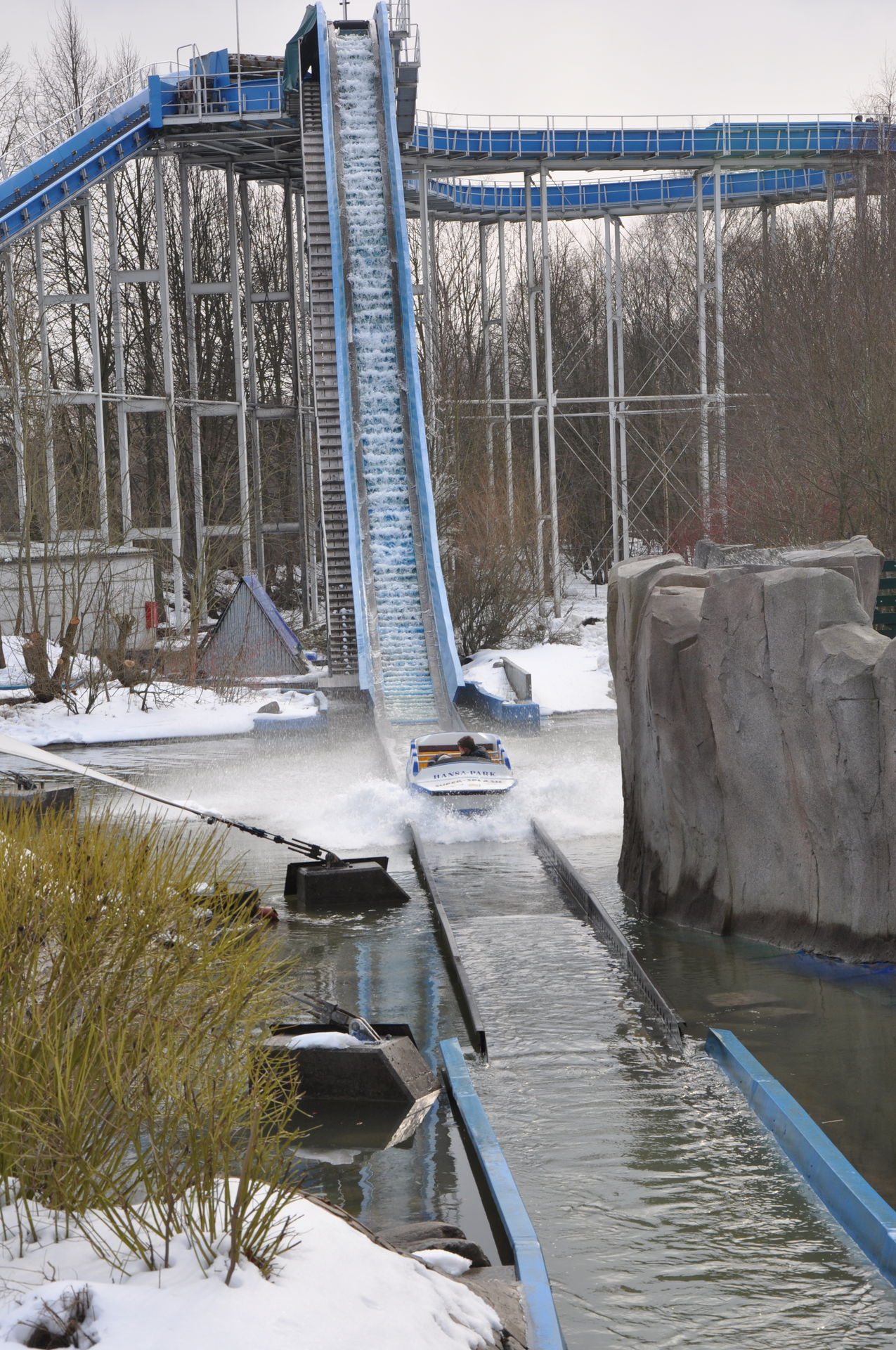 Hansa-Park Newsletter - März 2013 Auch die systematische Umgestaltung und Thematisierung des „Super-Splash“ wird für die Saison 2013 fortgeführt. 2012 wurde bereits der Auslauf bzw. die Bremsstrecke - nach dem Eintauchen der Boote in das Wasser - umgestaltet. Natürliche Fels-formationen geben schon seit vergangenem Frühjahr einen ersten Eindruck, wie die Anlage später aussehen wird, wenn die Boote durch ein historisches Schiffswrack hindurch in den See stürzen. Das Schiffswrack wird allerdings voraussichtlich erst im Laufe der Saison 2013 fertiggestellt werden.