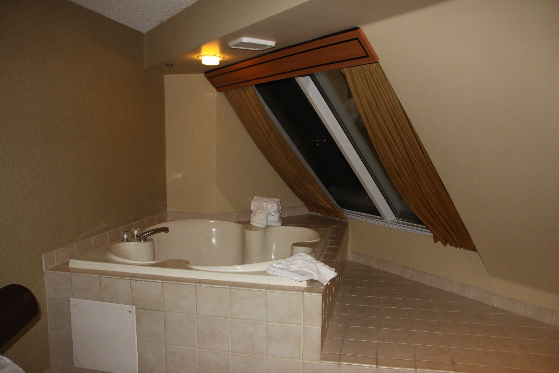 Zimmer innen. Ob das Jacuzzi mit einem direkten schönen Blick nach draußen im Wohn-/Schlafzimmer alle Zimmer haben, bezweifele ich stark. In einem großen Bad nahe der Zimmereingangstür (kein Foto) war eine Badewanne mit Duscheinsatz sowie zwei Waschbecken zu finden.