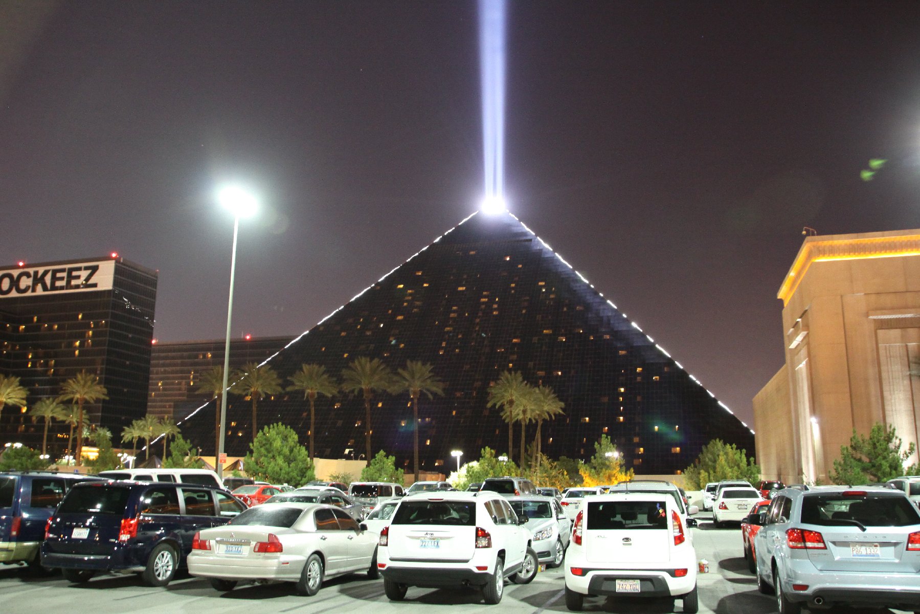 Luxor Hotel bei Nacht, hier die Rückseite vom Parkhaus aus