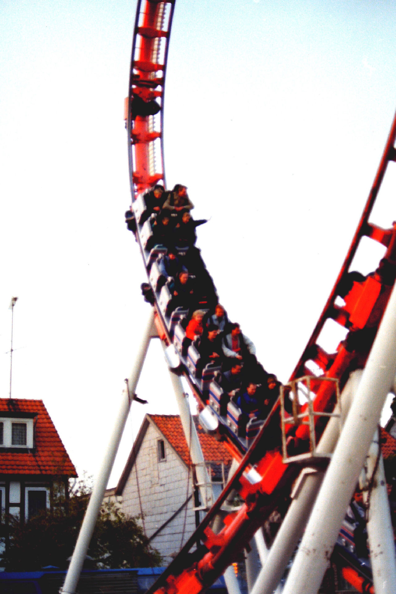 Du hättest eventuell noch anmerken sollen, Olli, dass vor dem ersten Durchfahren des Loopings der Zug erst "aufgeschaukelt wurde. Man ist vorwärts losgefahren, bis der erste Wagen am Ende der Reibräder angelangt war. Dann das ganze rückwärts. Der Backseat war hier der "place to be". Ohne Schulterbügel, nur mit Lapbar ... senkrecht in der Loopingschleife ... tja da hat man sich eben festgehalten.