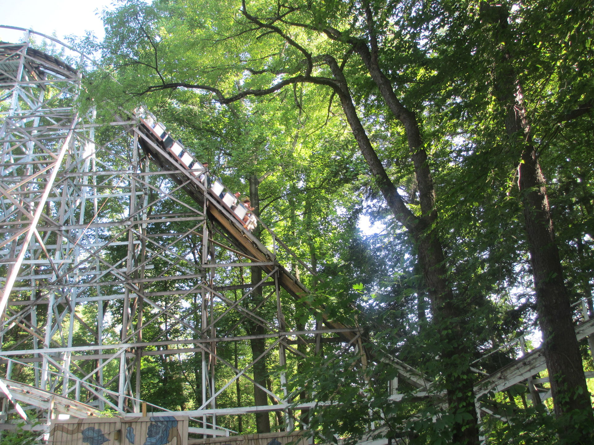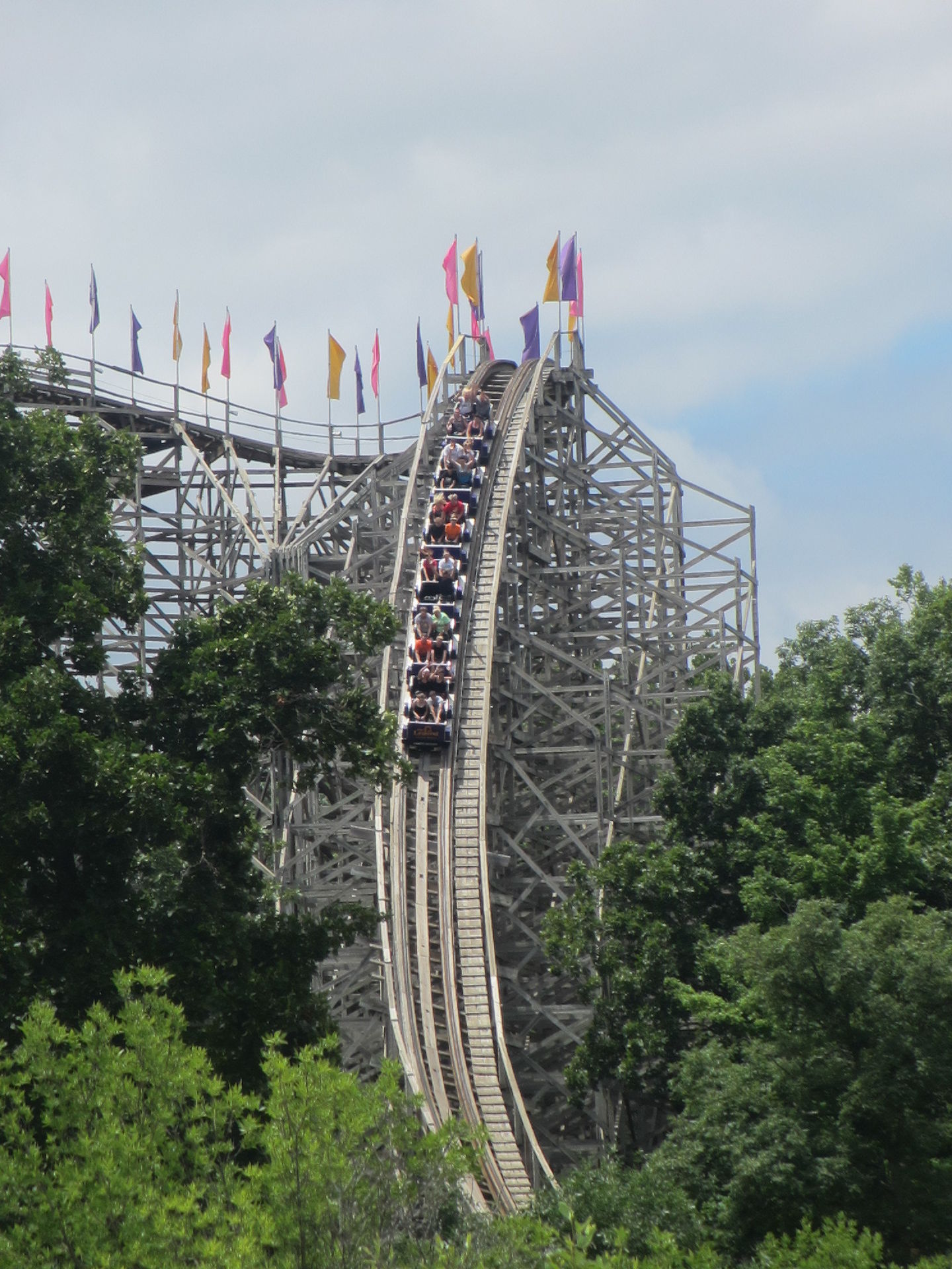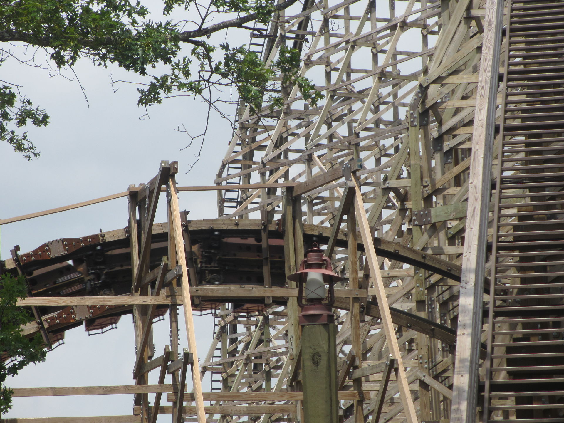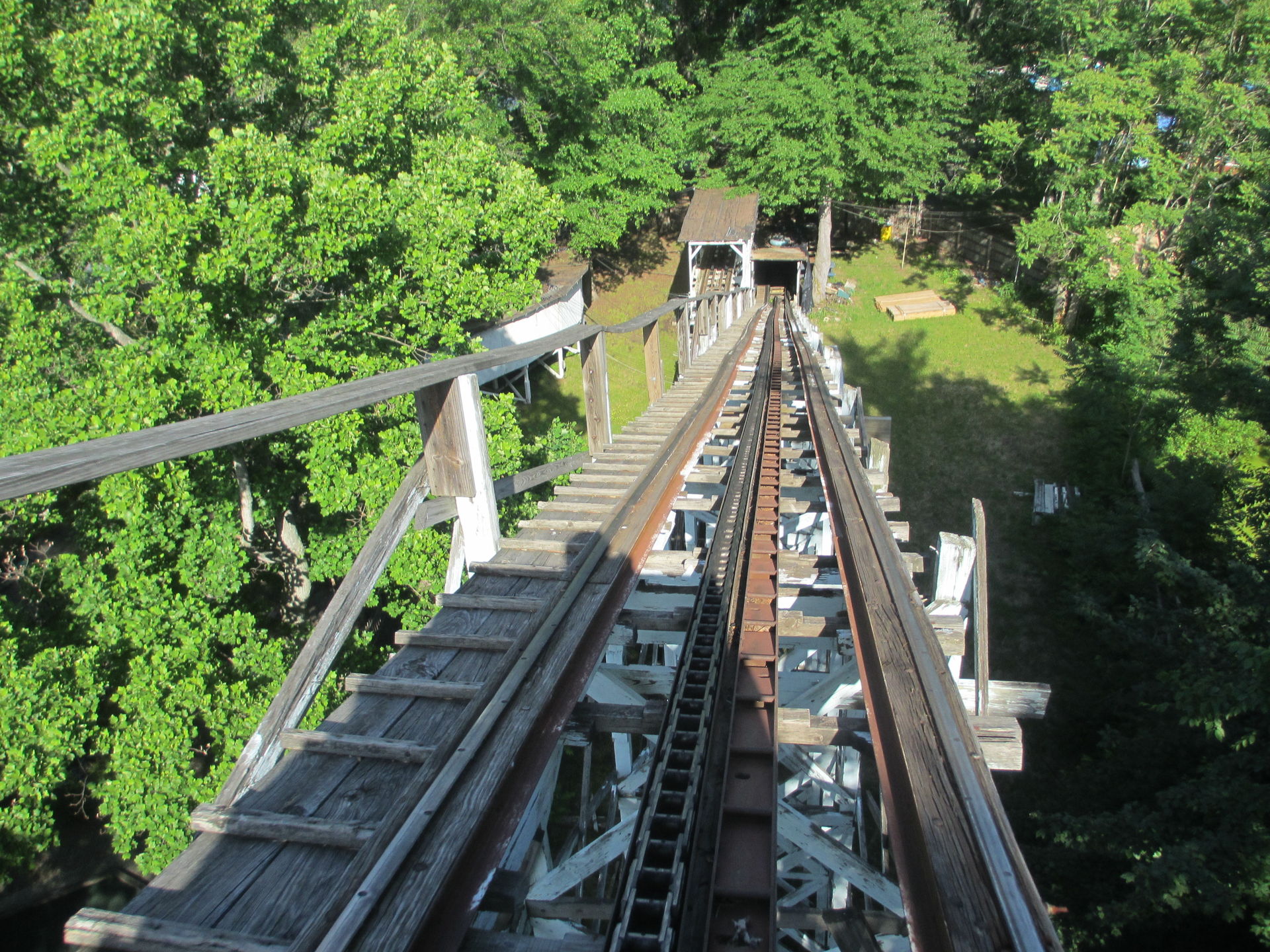 Na dass kann ja was werden ... Nie gekannte Torsionsbewegungen der einzelnen Wagen des Zuges steigern nicht gerade unser Vertrauen in das überreife Altholz. Unversehrt oben angekommen trauen wir unseren Augen nicht, welch unverschämt steilen und tiefen Drop dieser alte Tattergreis hier offenbart. Mein letzter Gedankengang, bevor wir gefühlt viel zu schnell den Abhang hinunterstürzen, beschäftigt sich mit der Fragestellung, ob wir diese Fahrt jemals lebend oder nur anschließend im Rollstuhl sitzend überstehen werden.
