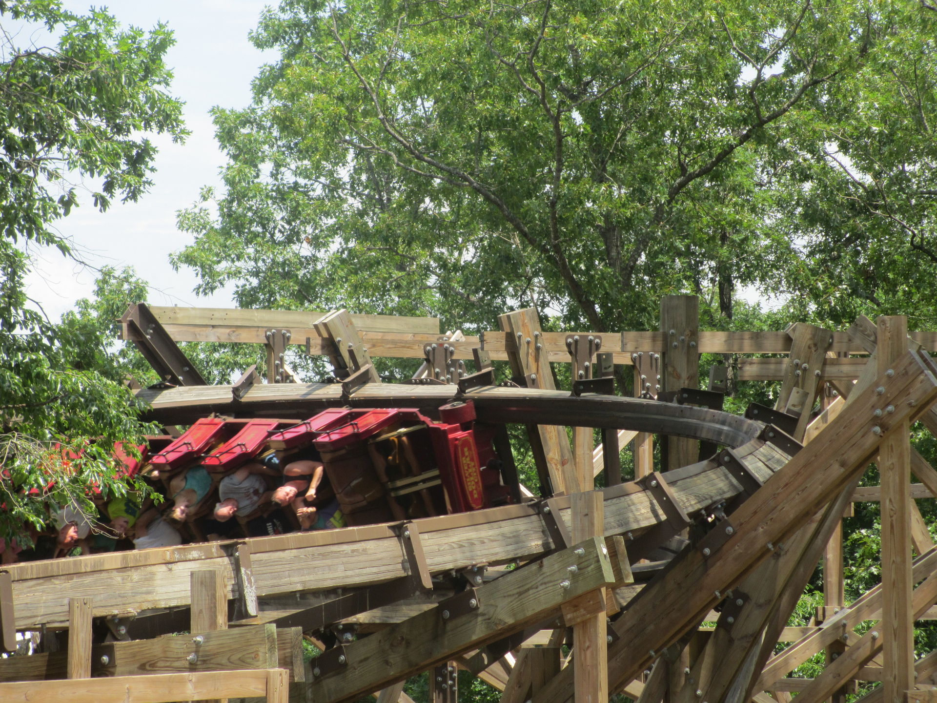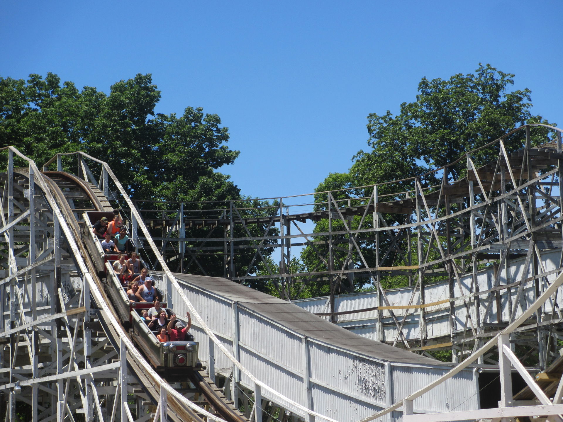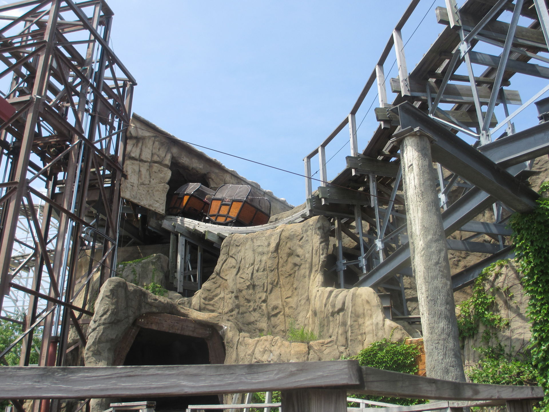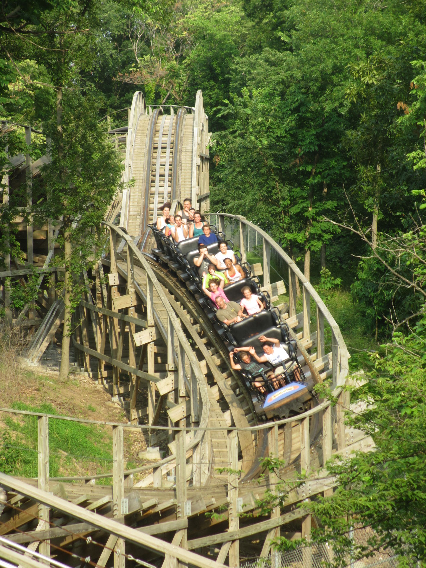 Na dass kann ja was werden ... Nie gekannte Torsionsbewegungen der einzelnen Wagen des Zuges steigern nicht gerade unser Vertrauen in das überreife Altholz. Unversehrt oben angekommen trauen wir unseren Augen nicht, welch unverschämt steilen und tiefen Drop dieser alte Tattergreis hier offenbart. Mein letzter Gedankengang, bevor wir gefühlt viel zu schnell den Abhang hinunterstürzen, beschäftigt sich mit der Fragestellung, ob wir diese Fahrt jemals lebend oder nur anschließend im Rollstuhl sitzend überstehen werden.