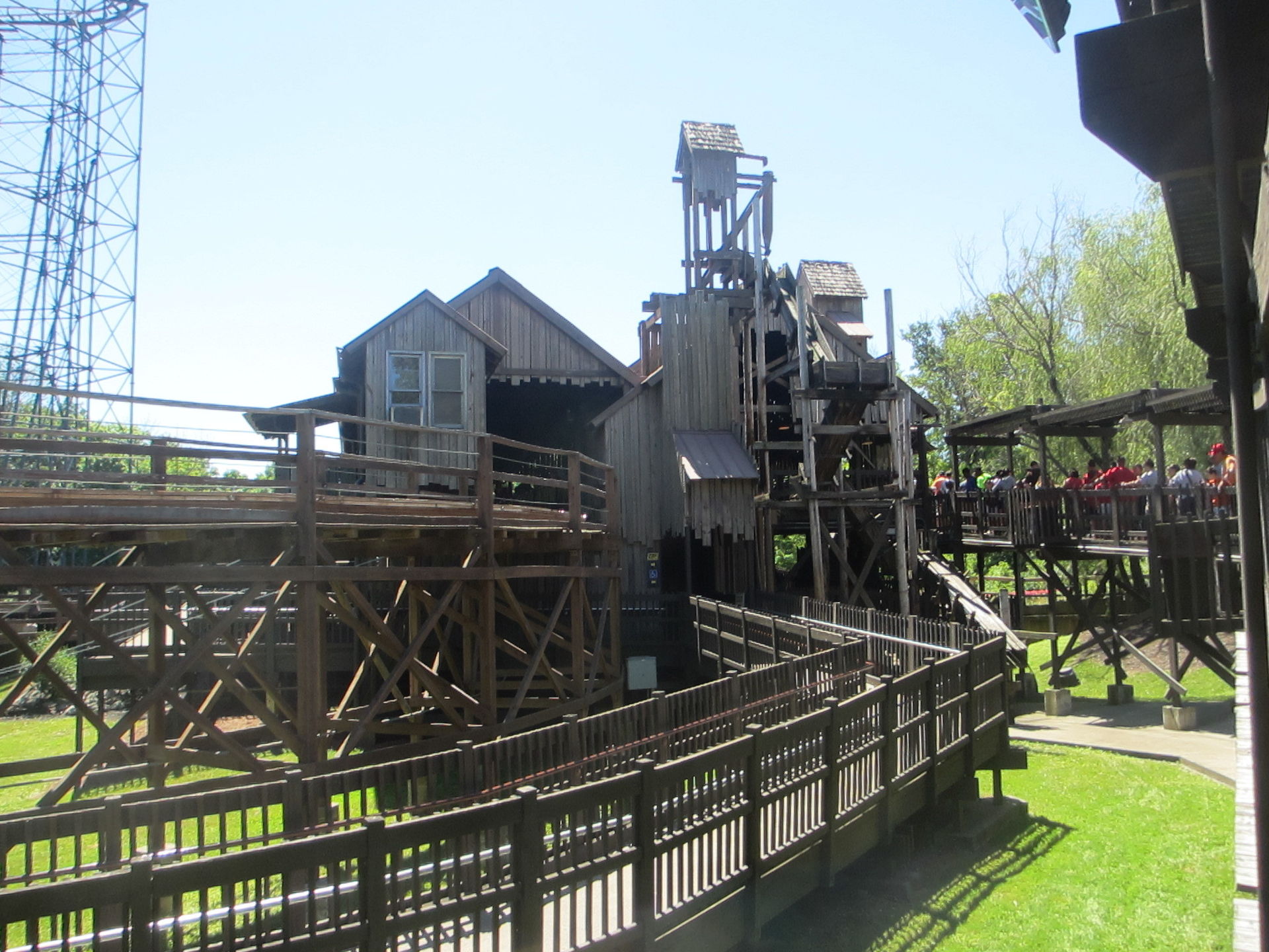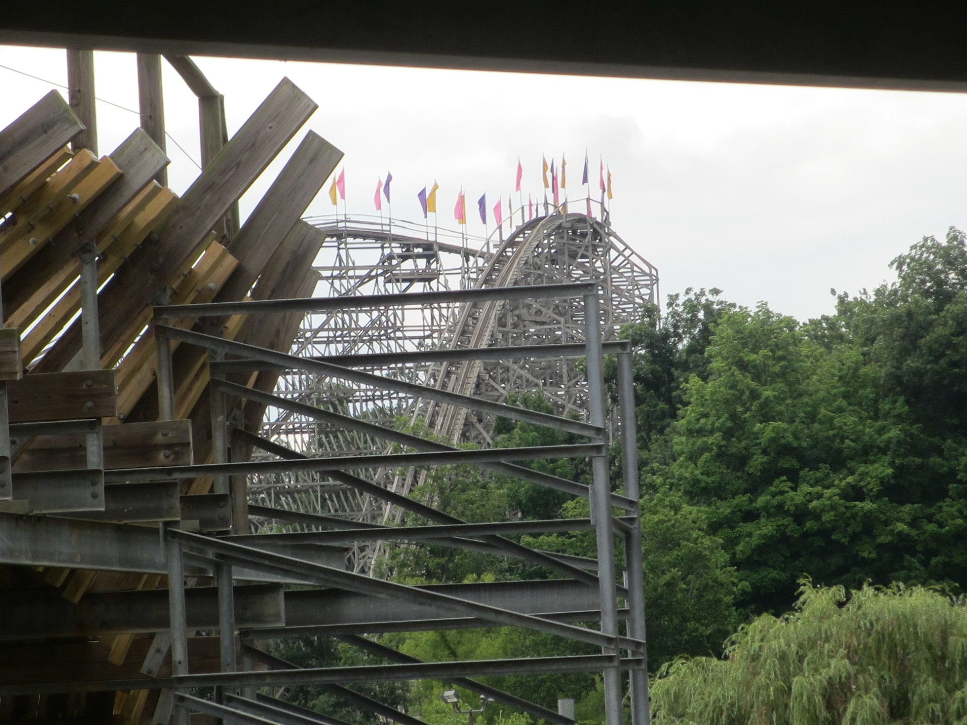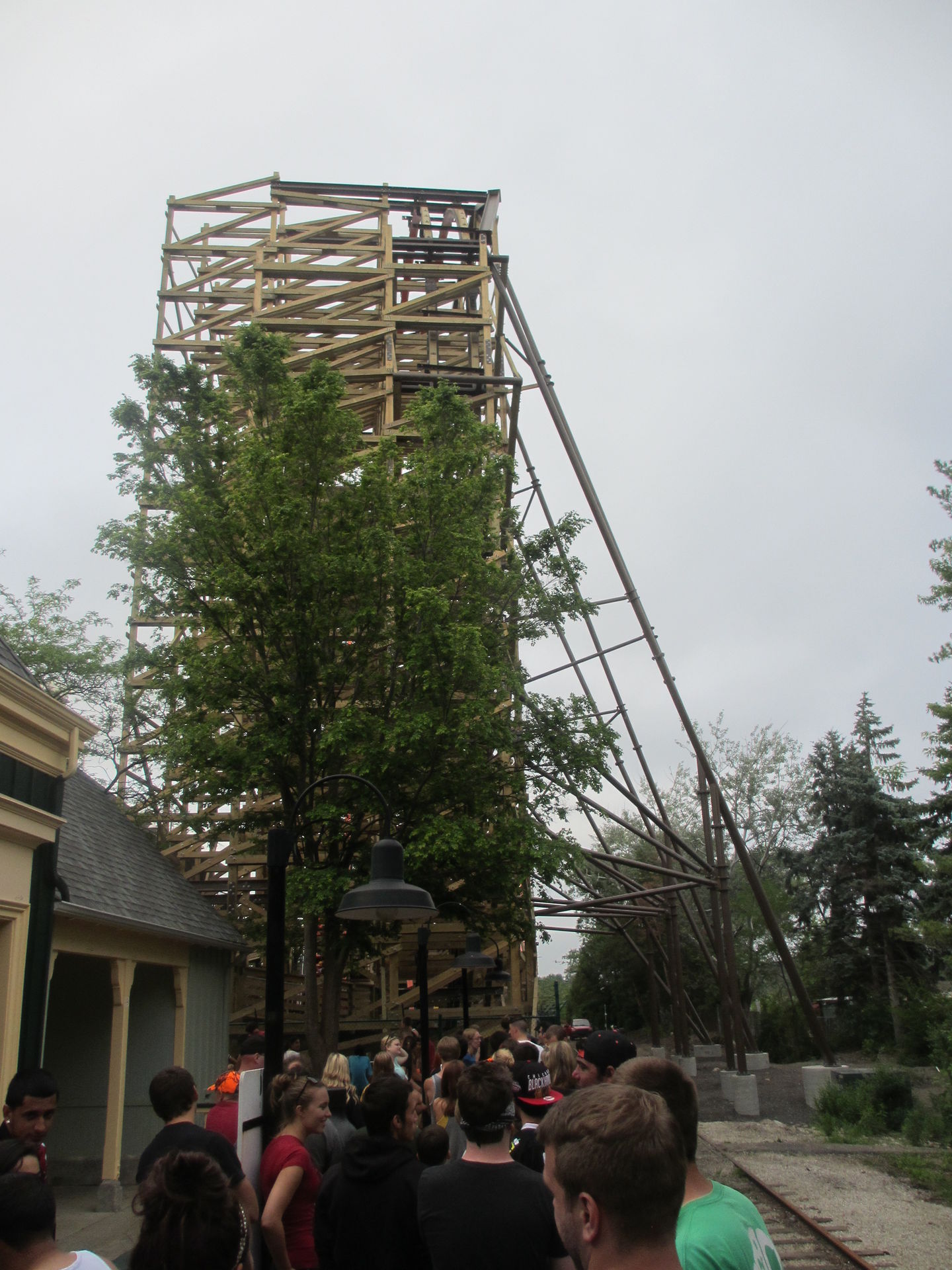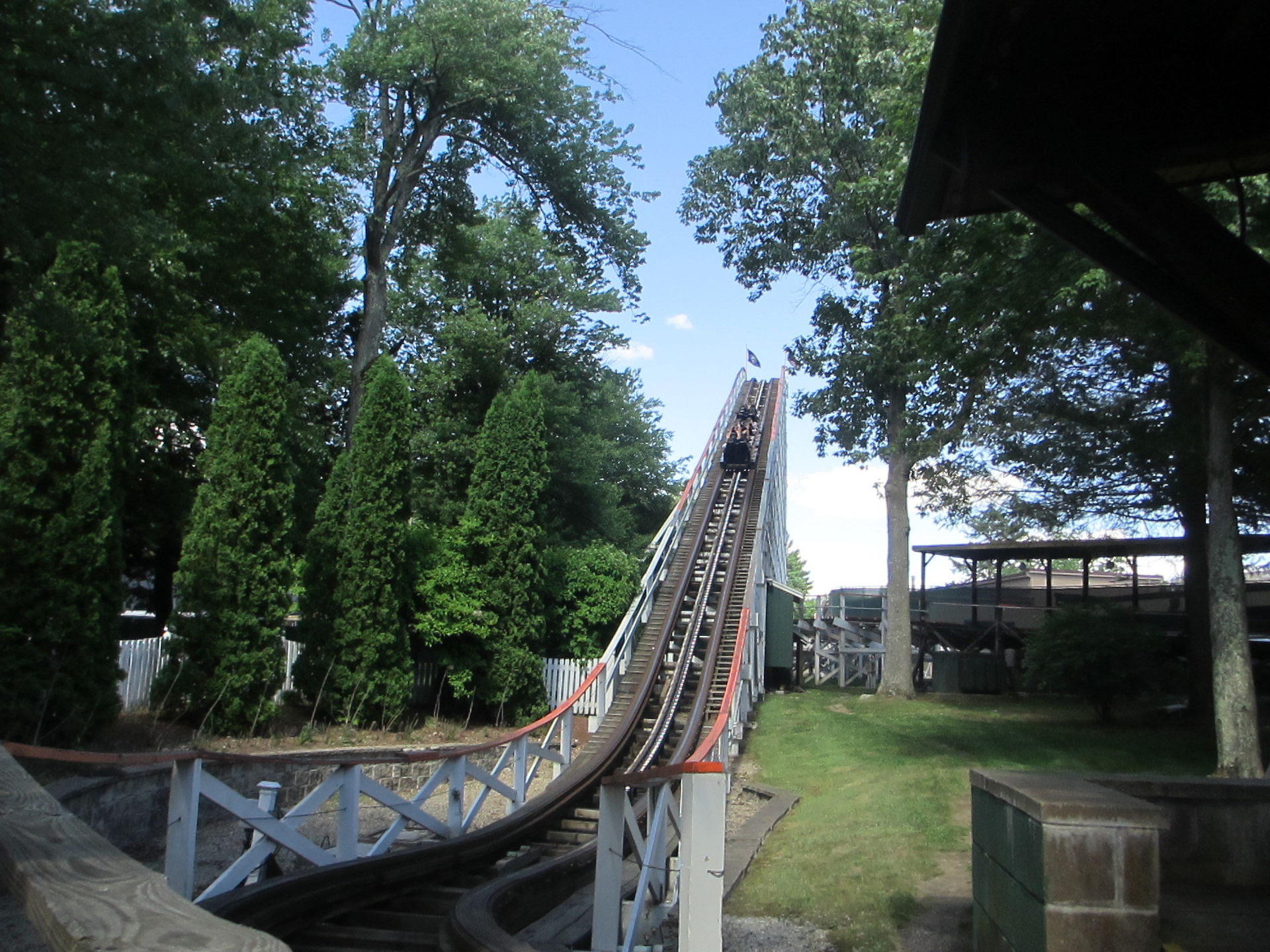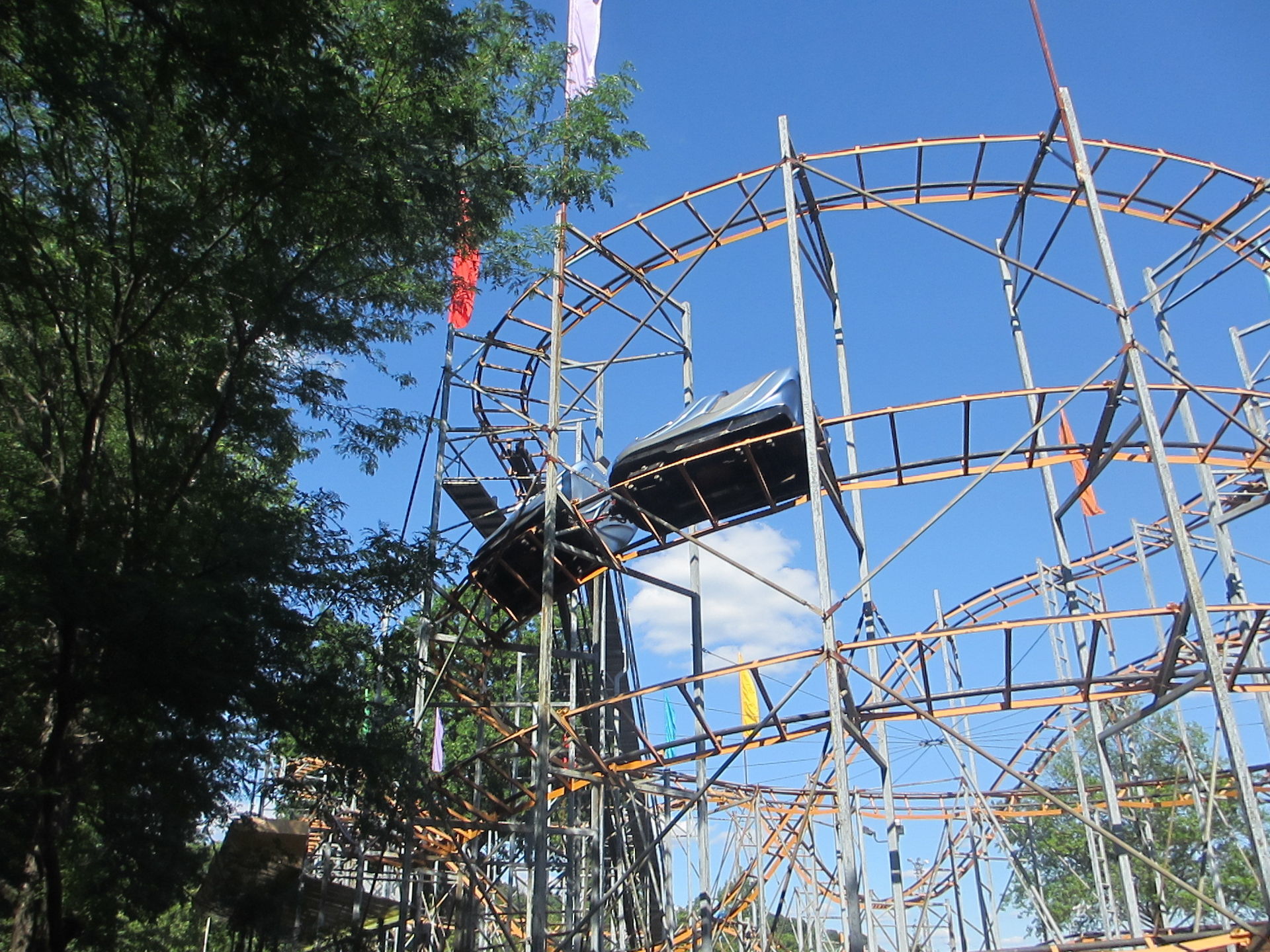 Na dass kann ja was werden ... Nie gekannte Torsionsbewegungen der einzelnen Wagen des Zuges steigern nicht gerade unser Vertrauen in das überreife Altholz. Unversehrt oben angekommen trauen wir unseren Augen nicht, welch unverschämt steilen und tiefen Drop dieser alte Tattergreis hier offenbart. Mein letzter Gedankengang, bevor wir gefühlt viel zu schnell den Abhang hinunterstürzen, beschäftigt sich mit der Fragestellung, ob wir diese Fahrt jemals lebend oder nur anschließend im Rollstuhl sitzend überstehen werden.