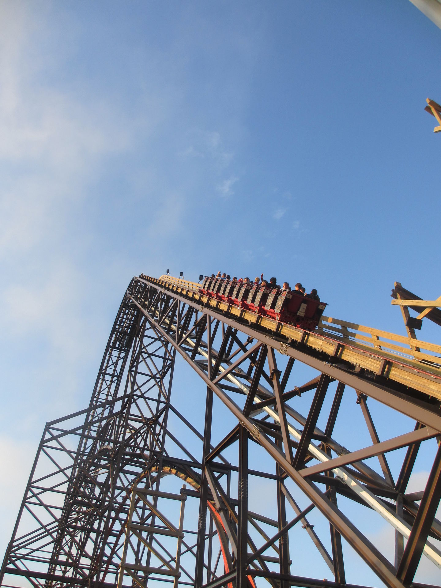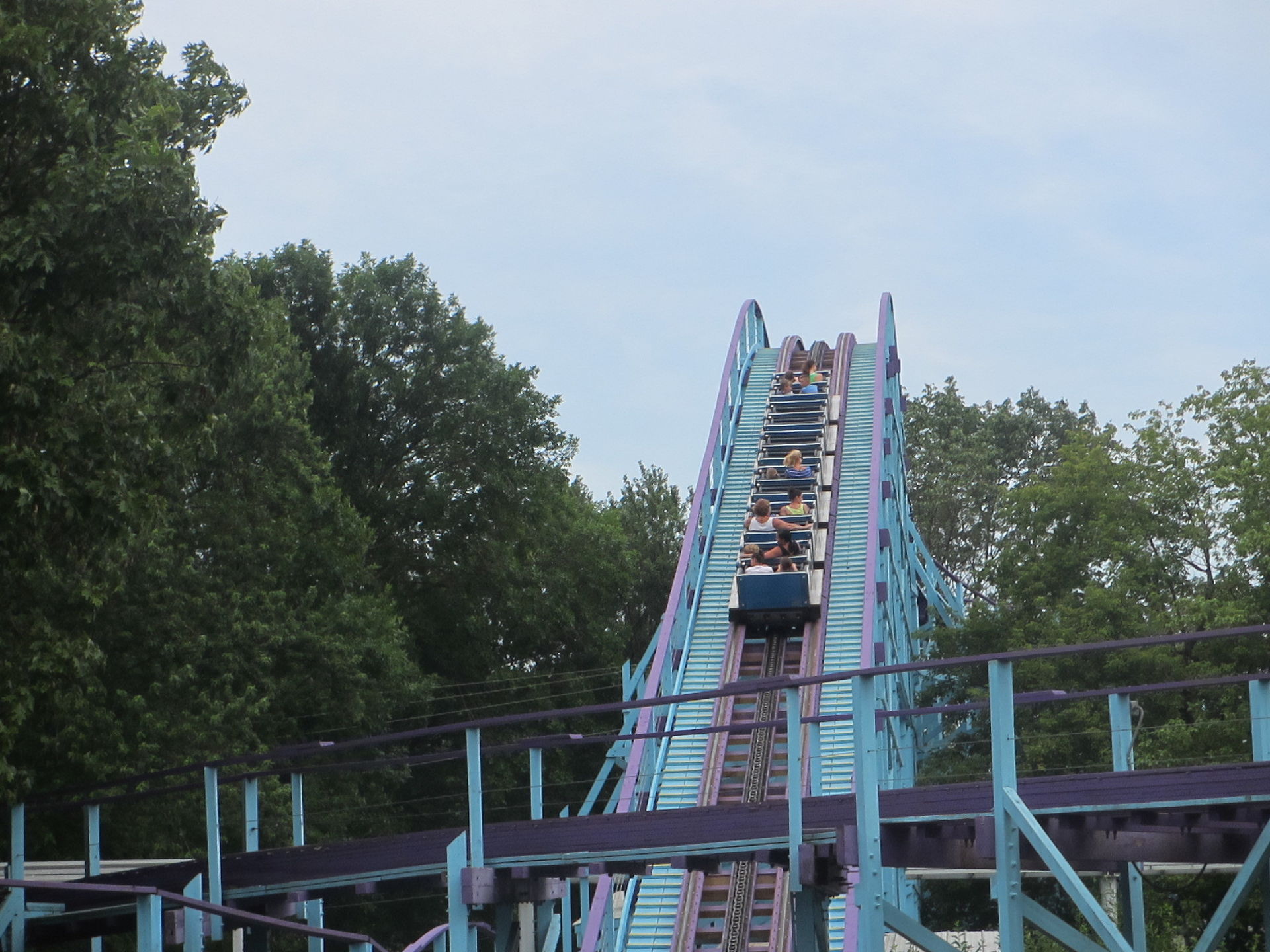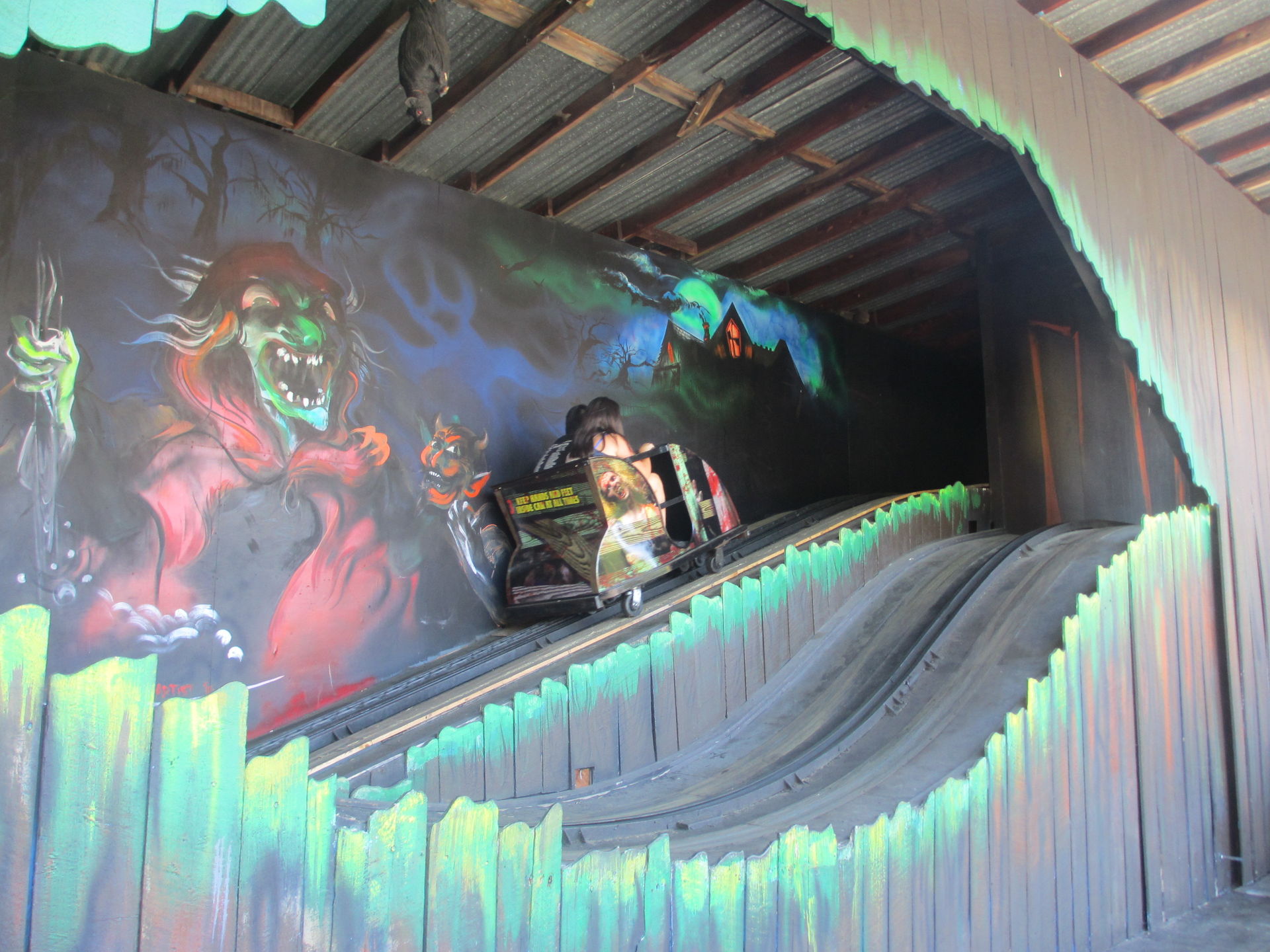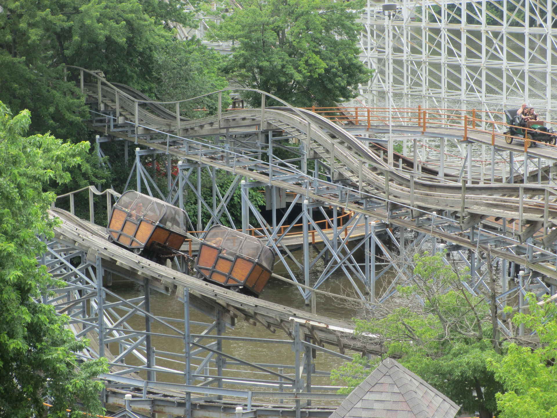 Na dass kann ja was werden ... Nie gekannte Torsionsbewegungen der einzelnen Wagen des Zuges steigern nicht gerade unser Vertrauen in das überreife Altholz. Unversehrt oben angekommen trauen wir unseren Augen nicht, welch unverschämt steilen und tiefen Drop dieser alte Tattergreis hier offenbart. Mein letzter Gedankengang, bevor wir gefühlt viel zu schnell den Abhang hinunterstürzen, beschäftigt sich mit der Fragestellung, ob wir diese Fahrt jemals lebend oder nur anschließend im Rollstuhl sitzend überstehen werden.