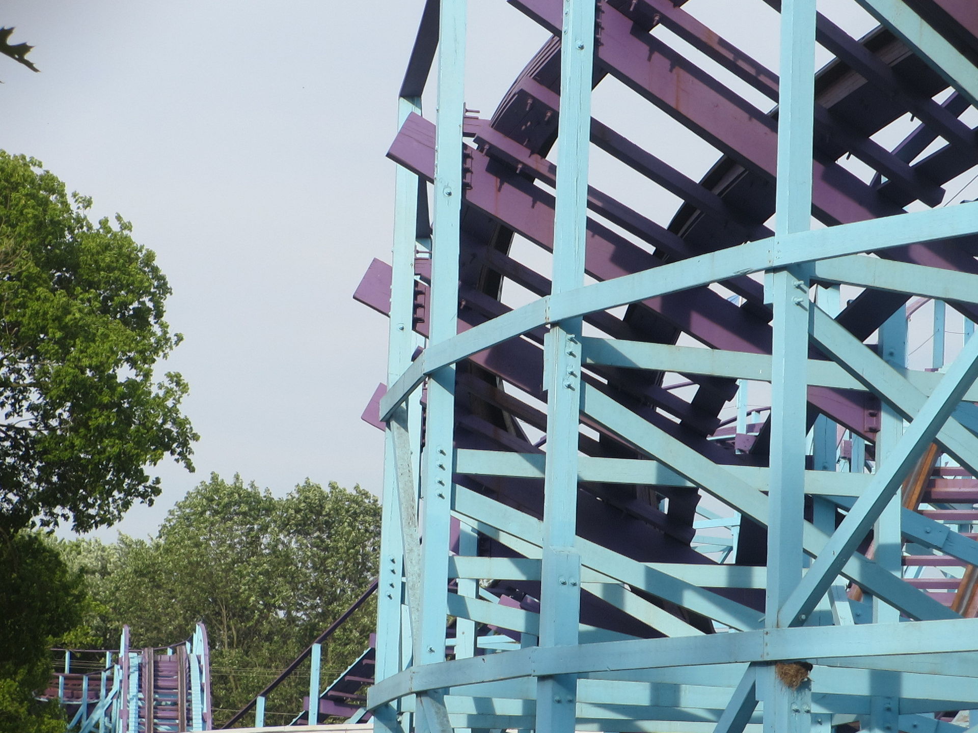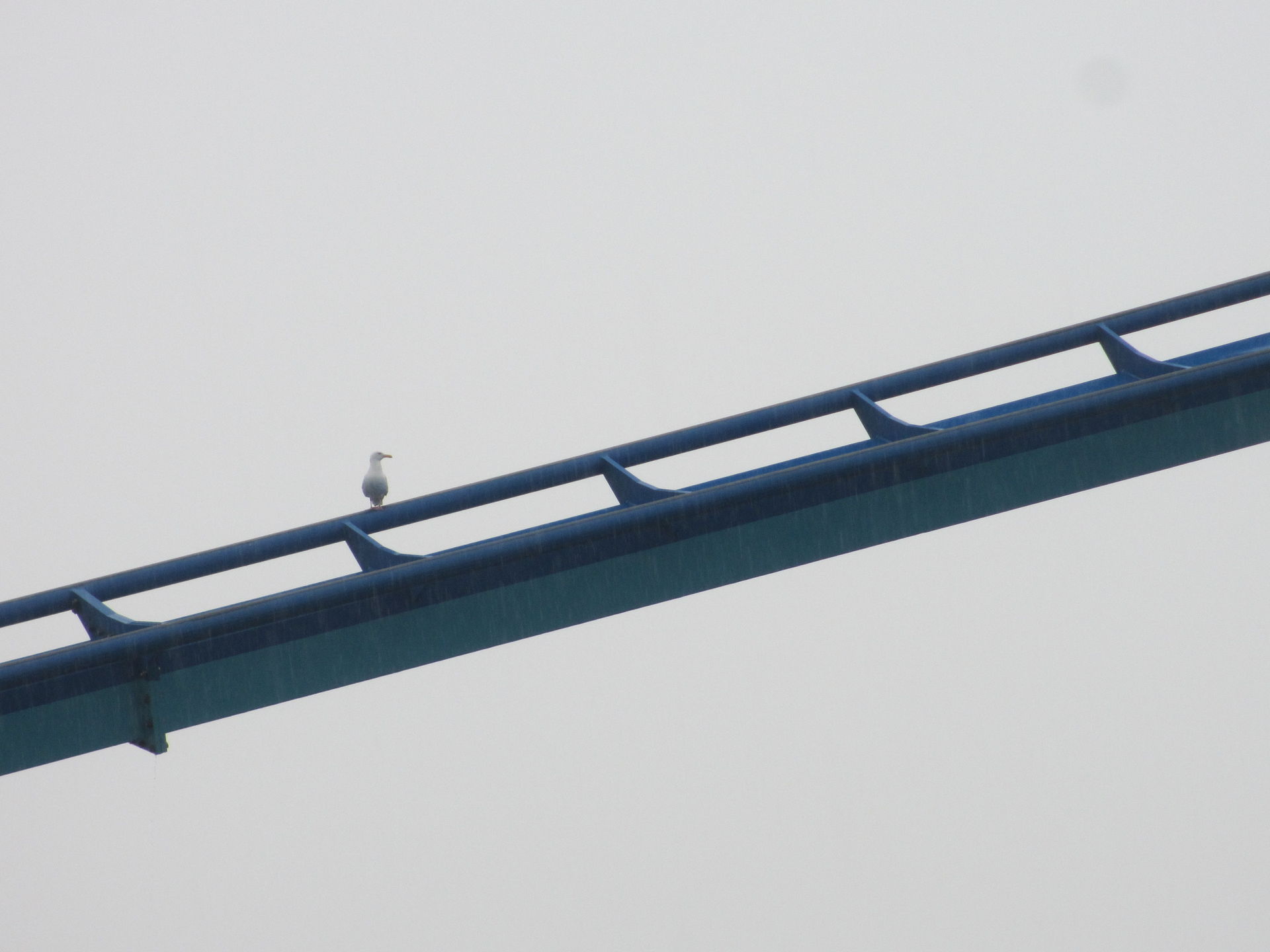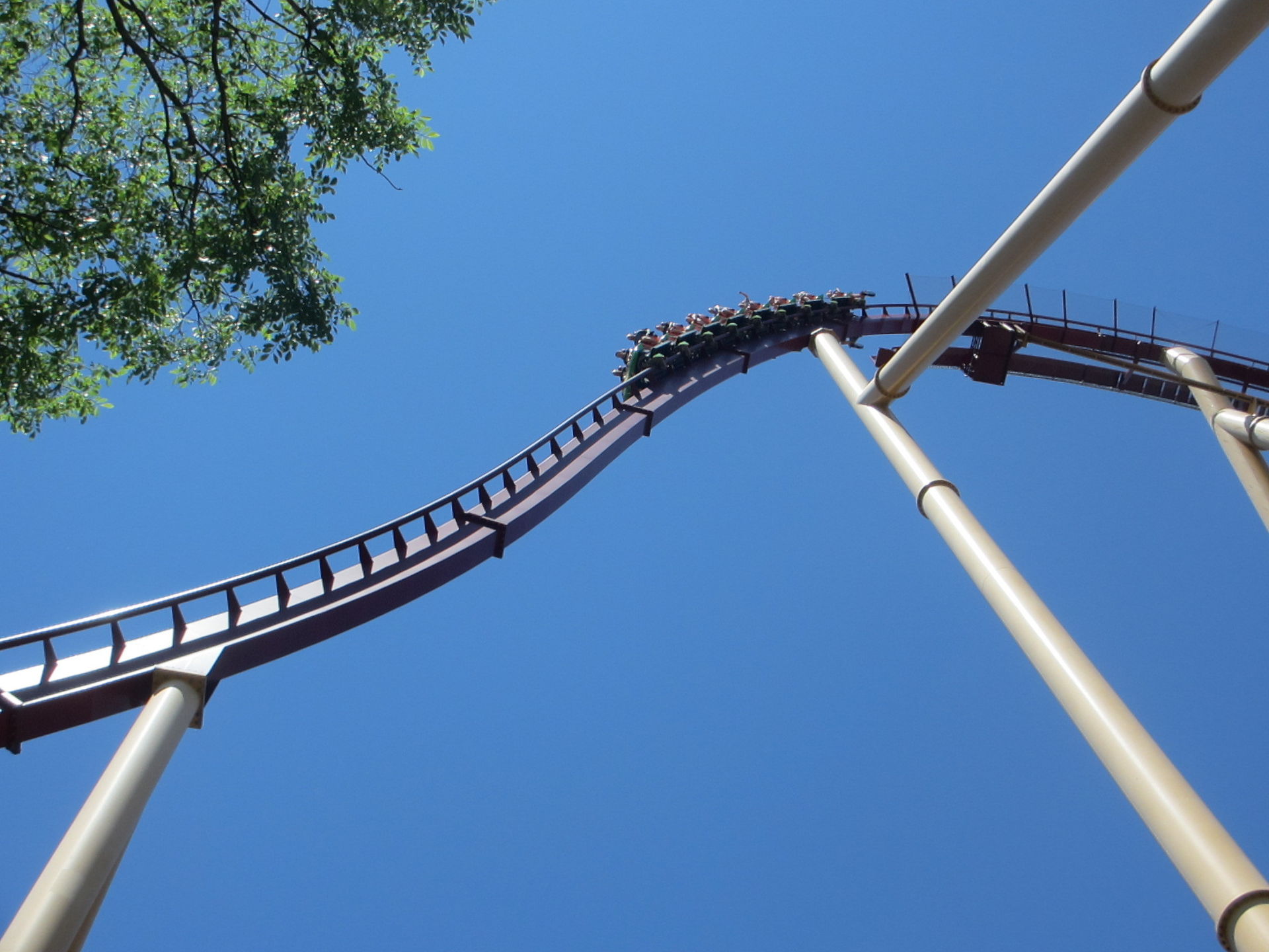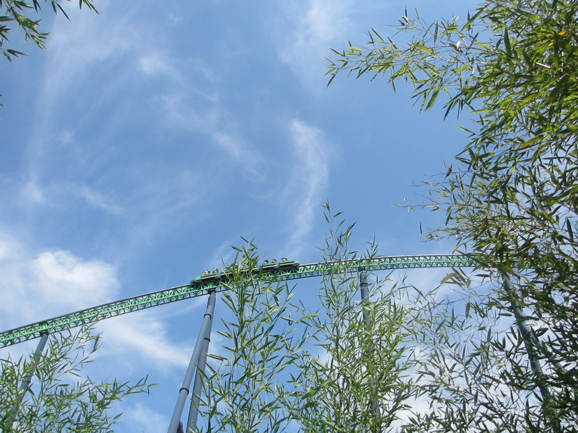 Zunächst scheint es so, als hätten wir heute wieder Glück und der letztgenannte Punkt müsse nach 2010 wieder unerledigt bleiben, denn auf dem Lifthill des Suspended Looping Coasters unserer nicht bevorzugten Achterbahnherstellermarke steckt der Zug fest.