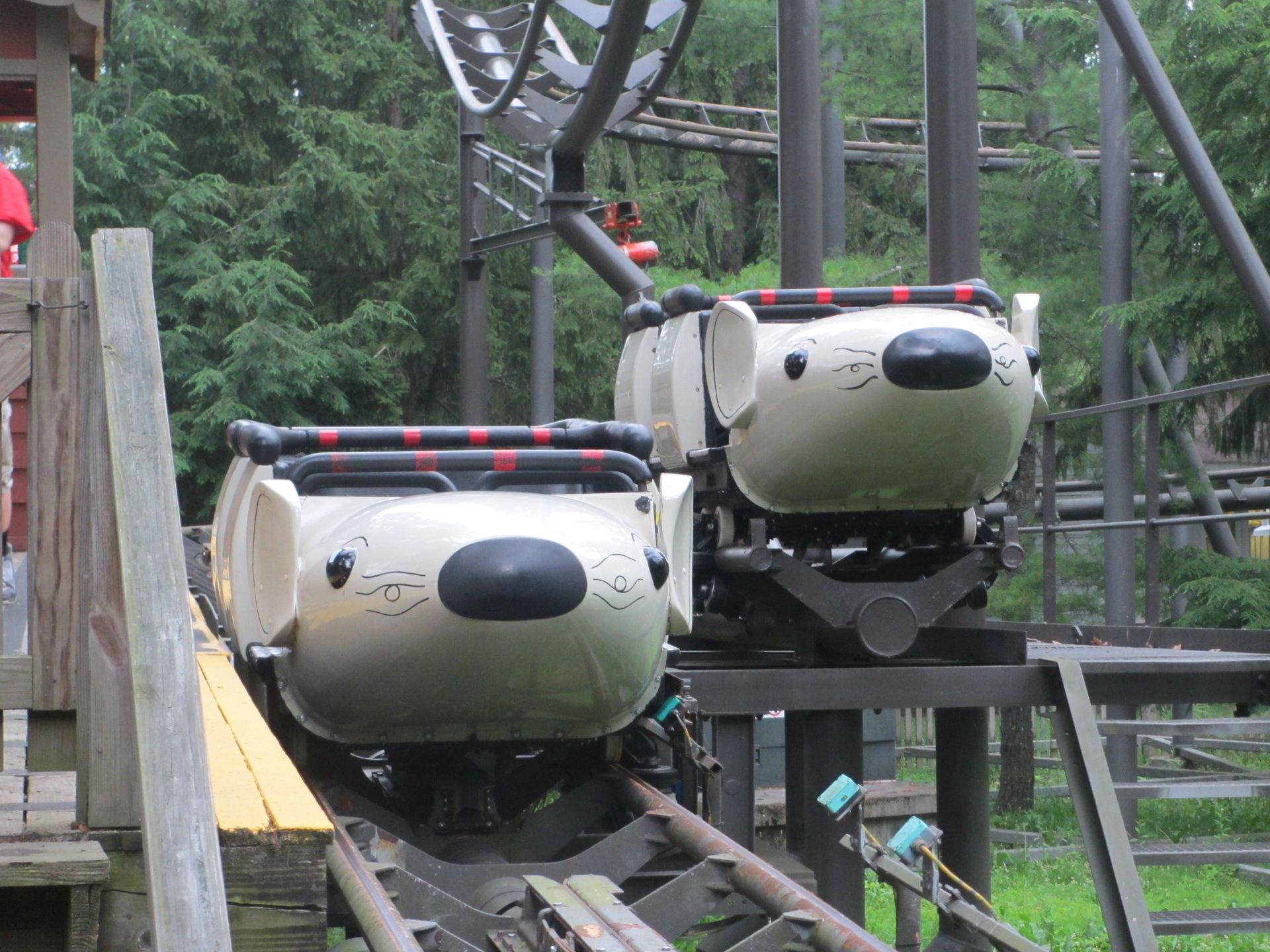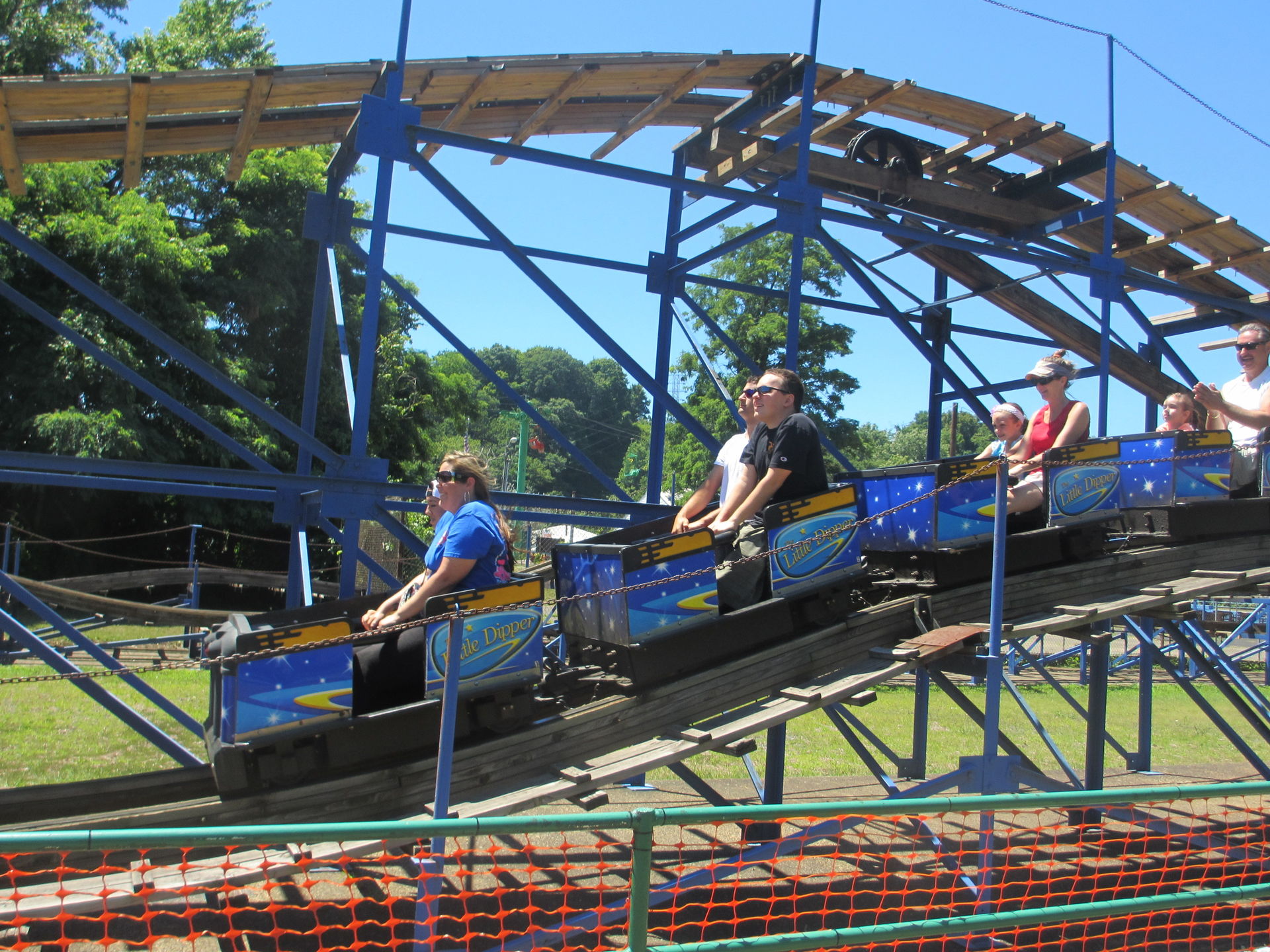 Als erstes fällt uns der stillgelegte Tobbogan ins Auge. Na gut, das ist jetzt nicht so der große Verlust. Etwas zwischen den Bäumen versteckt finden wir den Little Dipper, der hier aber leider nur echte Kinder und nicht Kind-gebliebene Erwachsene bespaßen darf.