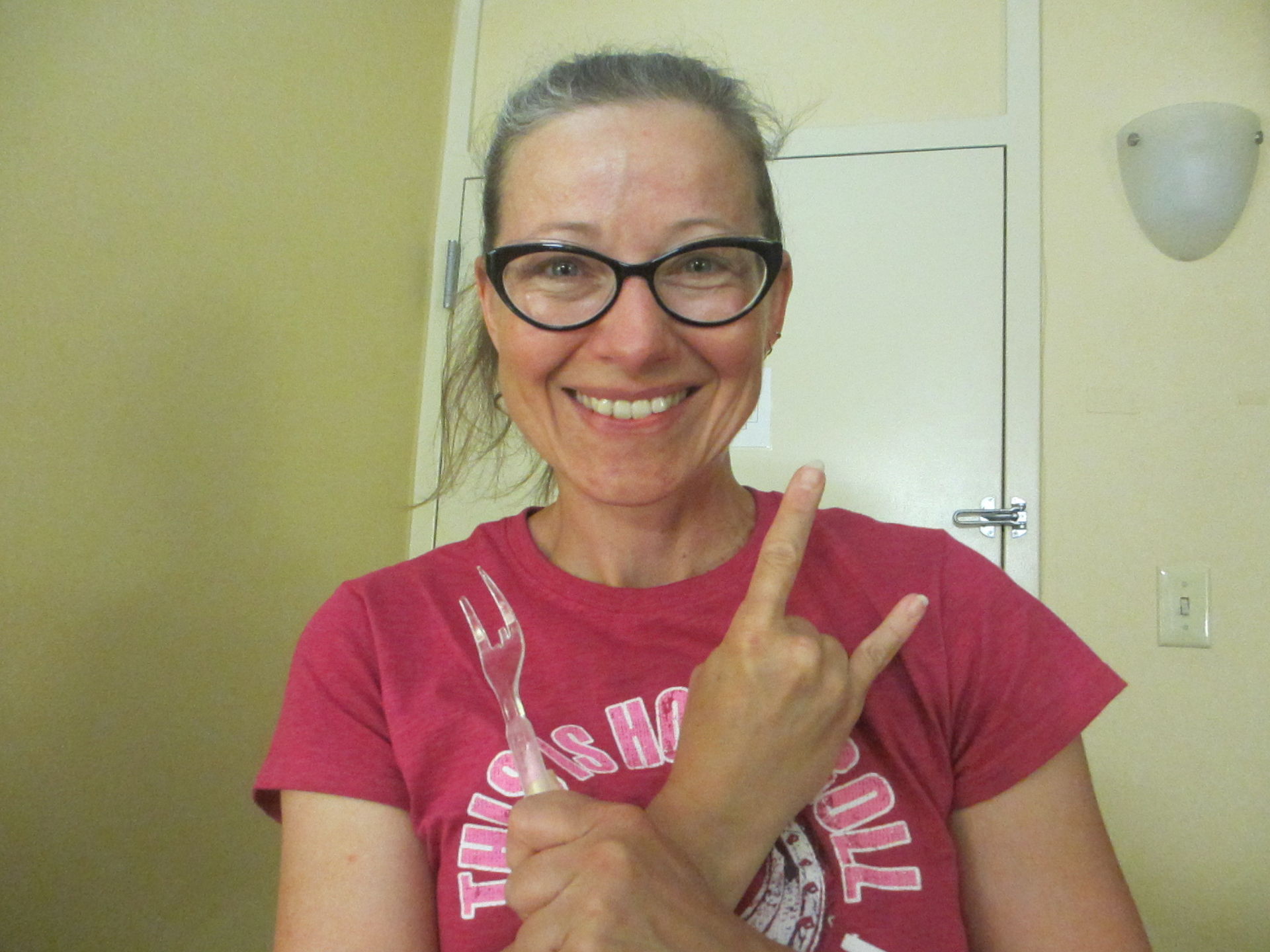 Abends beim Abendessen gibt unser Plastikbesteck, das wir auf dem Hinflug aus dem Flugzeug mitgenommen hatten, den Geist auf. Mehr als drei Wochen Salat sind einfach zuviel für die KLM-Gabeln. Mal sehen, vielleicht versteigern wir sie bei ebay als Zubehör für Wacken-Camper ...