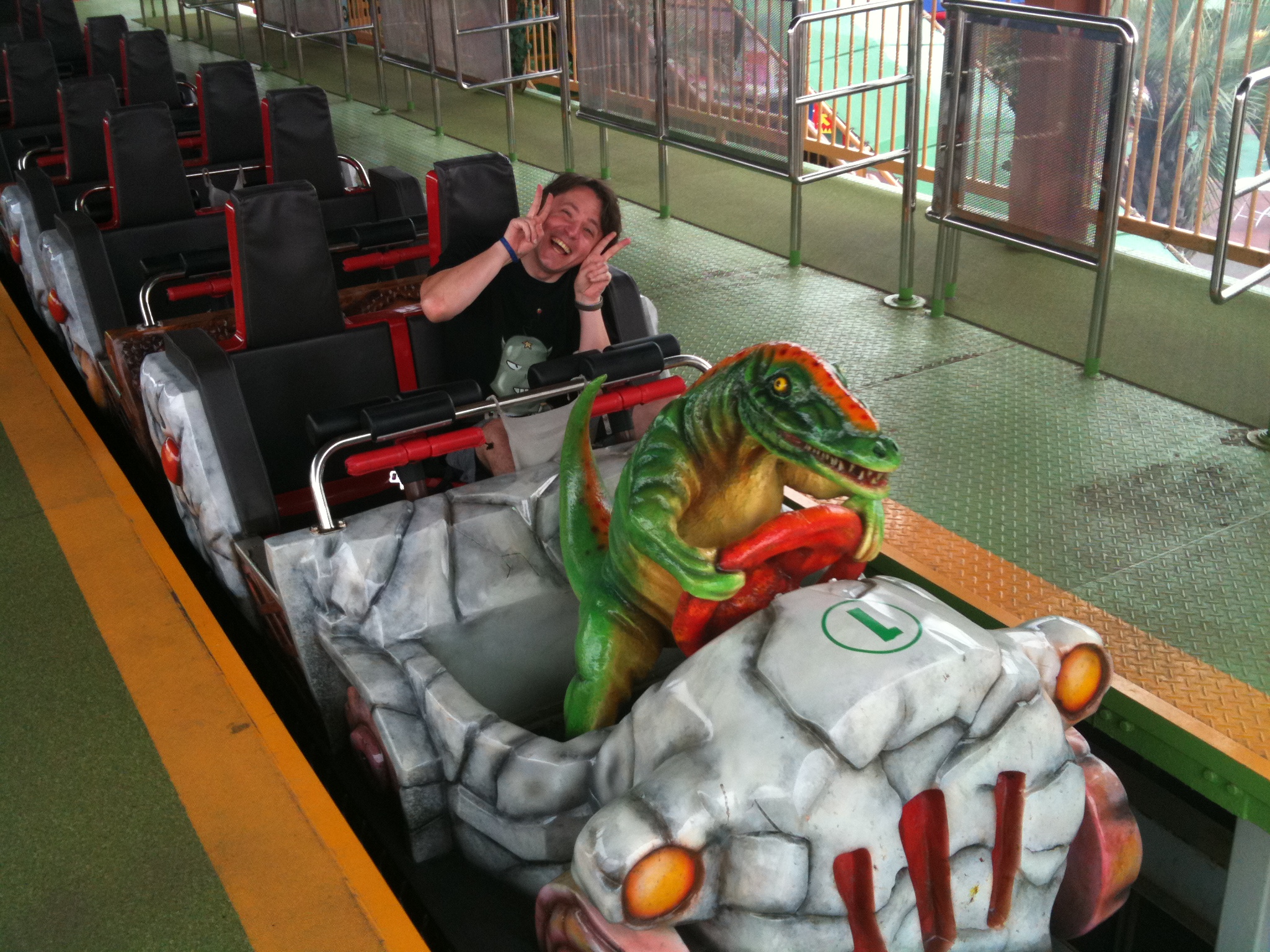 Der Playlandpark bietet uns neben einer sehr ausgeleierten Whip gleich noch ein altes Holzschätzchen, den Drachencoaster, und obwohl es zu dieser Stunde hier richtig heiß ist und meine kurze Hose und Sandalen noch mit der Anreise beschäftigt sind, haben wir hier wiederholten Fahrspaß, den uns auch das desinteressierte Personal nicht weglangweilen kann. Den kleinen Kinderwoodie mit den schicken Wägelchen dürfen wir leider nicht fahren, schade!