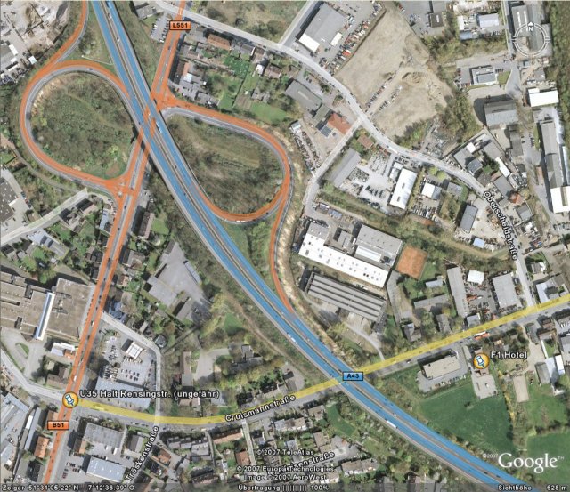 Wie man sieht ist die Haltestelle Rensingstr. der U35 wirklich nur 600 Meter vom F1 weg. Wenn also jemand doch mit dem Zug kommen müßte *zu.speedfreak.rüberschiel*. Fahrplaninfos gibt es unter vrr.de