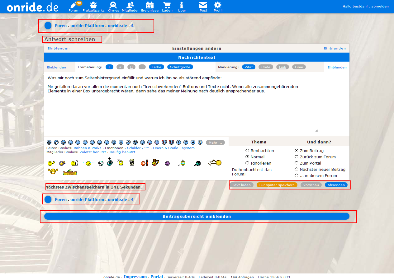 Ich habe mich da auf den Post von Vampics bezogen und in erster Linie geht es da meiner Meinung nach um das Portal. Man könnte ein Raster einführen nach dem die Boxen sich richten, so wie es mittlerweile bei contentbasiertem Webdesign sehr üblich geworden ist. um vertikal etwas mehr Ordnung reinzubringen. Ist allerdings nicht mal so eben gemacht. Insgesamt sind die Boxen - natürlich bedingt durch ihre Vielfalt - nicht immer ganz auf einer "Wellenlänge". Vielleicht wäre es auch möglich, die neuerdings sehr lang gewordenen Freizeitpark- und Fotobericht-Boxen etwas zu kürzen, aber dafür mit einer Blättern-Funktion auszustatten. Bei den Fotoberichten geht es noch, da man sie ja auf Top5 umschalten kann.