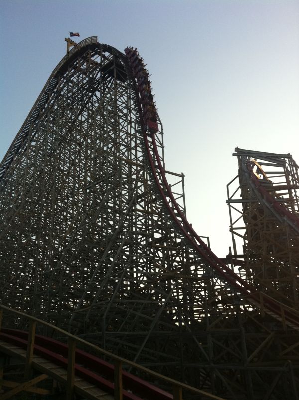 Ein wahnsinns Geschoss, es hat mit einer Holzachterbahn allerdings nicht mehr viel zu tun. Die Bahn gleitet dermaßen ruhig über den Track, dass man die Holzkonstruktion zwar vor Augen hat, aber sie auch genau so schnell wieder vergisst.
