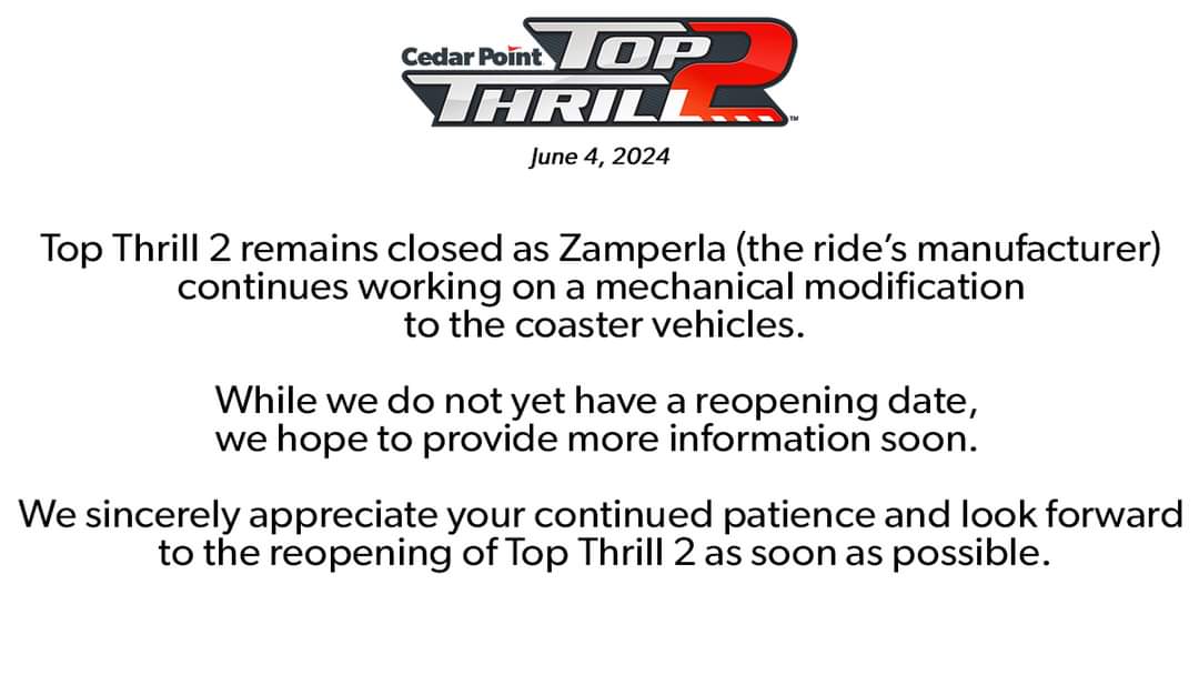 Die Gerüchte der amerikanischen Fans scheinen von "macht nächstes Wochenende wieder auf" bis "macht diese Saison gar nicht mehr auf" zu gehen. Selbst wenn man das ganze schnell wieder in den Griff bekommt. Dass der Park so ein Statement setzt und Zamperla darin erwähnt ist kein gutes Zeichen.