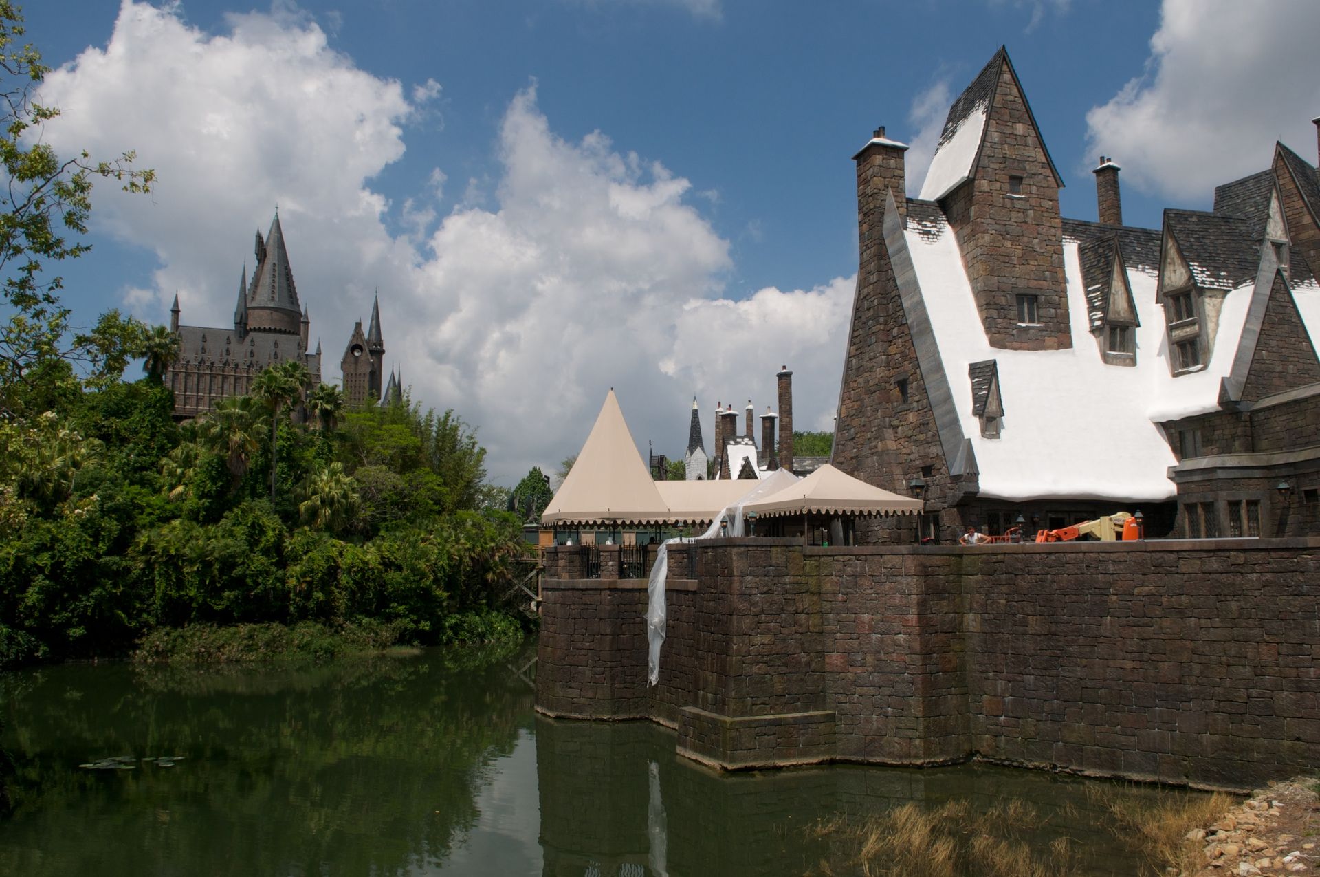 1) Die Warteschlange wird im Jahr der Eröffnung gebaut. Obwohl gerade die Major Attractions da in Orlando auf beeindruckende Weise auf hohe Kapazität und schnelle Abfertigung ausgelegt sind, wollen gerade bei einer Attraction wie Harry Potter natürlich erst mal ALLE da rein - bei einem Park, der pro Jahr rund 5-6 Millionen Besucher durchschleusen dürfte, wird's da VOLL. Zumindest anfangs.
