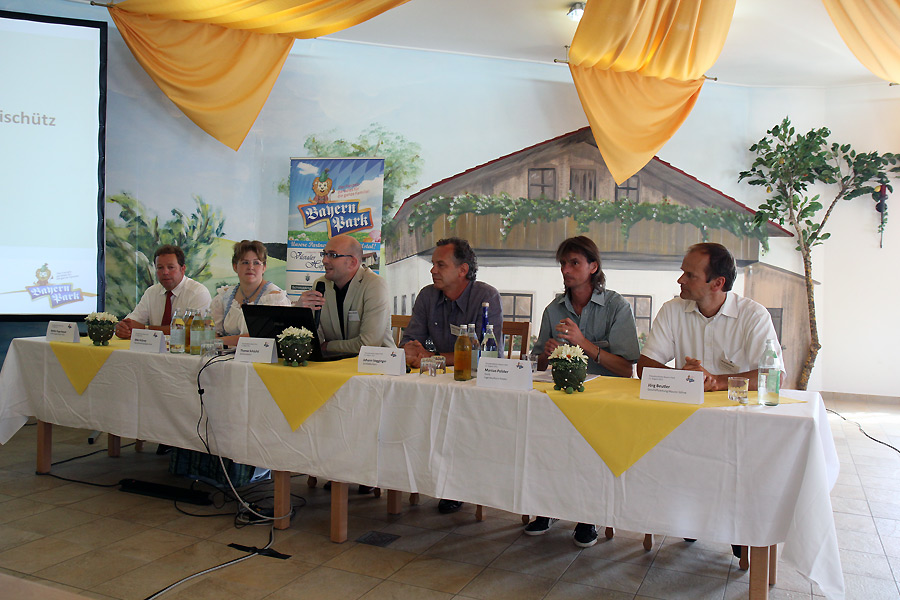 v.l.n.r.: Walter Kagerbauer (Pressesprecher Bayern Park), Silke Holzner (Geschäftsführerin Bayern Park), Thomas Schächtl (allmender GmbH, Kommunikation für den Bayern Park), Johann Vogginger (Architekt für die Thematisierung), Marcus Polster (Statikingenieur) und Jörg Beutler (Geschäftsführer Maurer Söhne)