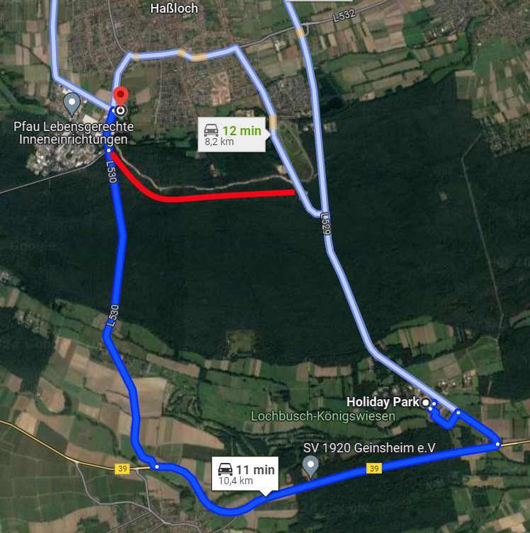 Kann es vielleicht sogar sein, dass man gerade an einer direkteren Verbindung Zwischen Hopa und Badepark arbeitet? Siehe rote Linie, da würde man sich viel Umweg sparen (sowie Haßloch sich viel unnötigen Ortsverkehr) - und wenn es nur eine Privatstraße für Shuttle und Radfahrer ist.