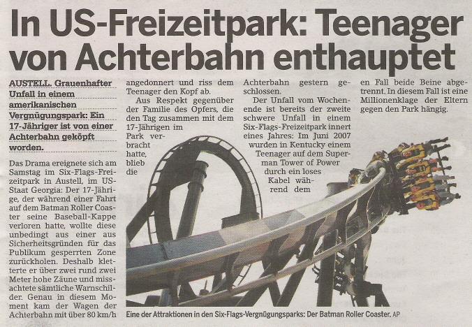 Der arme Park. Schnüff. Wo wird denn Sixflags durch den Dreck gezogen? Beide Unfälle sind schlimm. Und ich denke in beiden konnte der Park recht wenig tun, um sie zu verhindern.