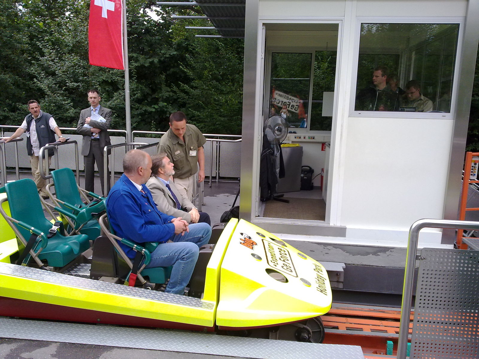 Am heutigen Donnerstag fand nun nach mehr als drei Monaten die langersehnte Wiederinbetriebnahme der Expedition GeForce in Hassloch statt. Wir erinnern uns alle an den 28.04.2010, als EGF gegen 15.30h auf dem zweiten Camelback mit eingeknicktem Wagengelenk zwischen dem 3. und 4. Wagen in 20 Metern Höhe mit 26 Personen an Bord zum Stehen kam. Was war damals passiert und wieso? Diese Fragen sollten heute beantwortet werden. Der geladenen Presse - übrigens nur Vertreter, die auch bereits bisher über die Vorkommnisse berichteten - stellten sich der geschäftsführende Gesellschafter und Parkdirektor Herr Schneider, der technische Leiter Herr Manzke sowie der Marketingleiter Herr Mallasch.