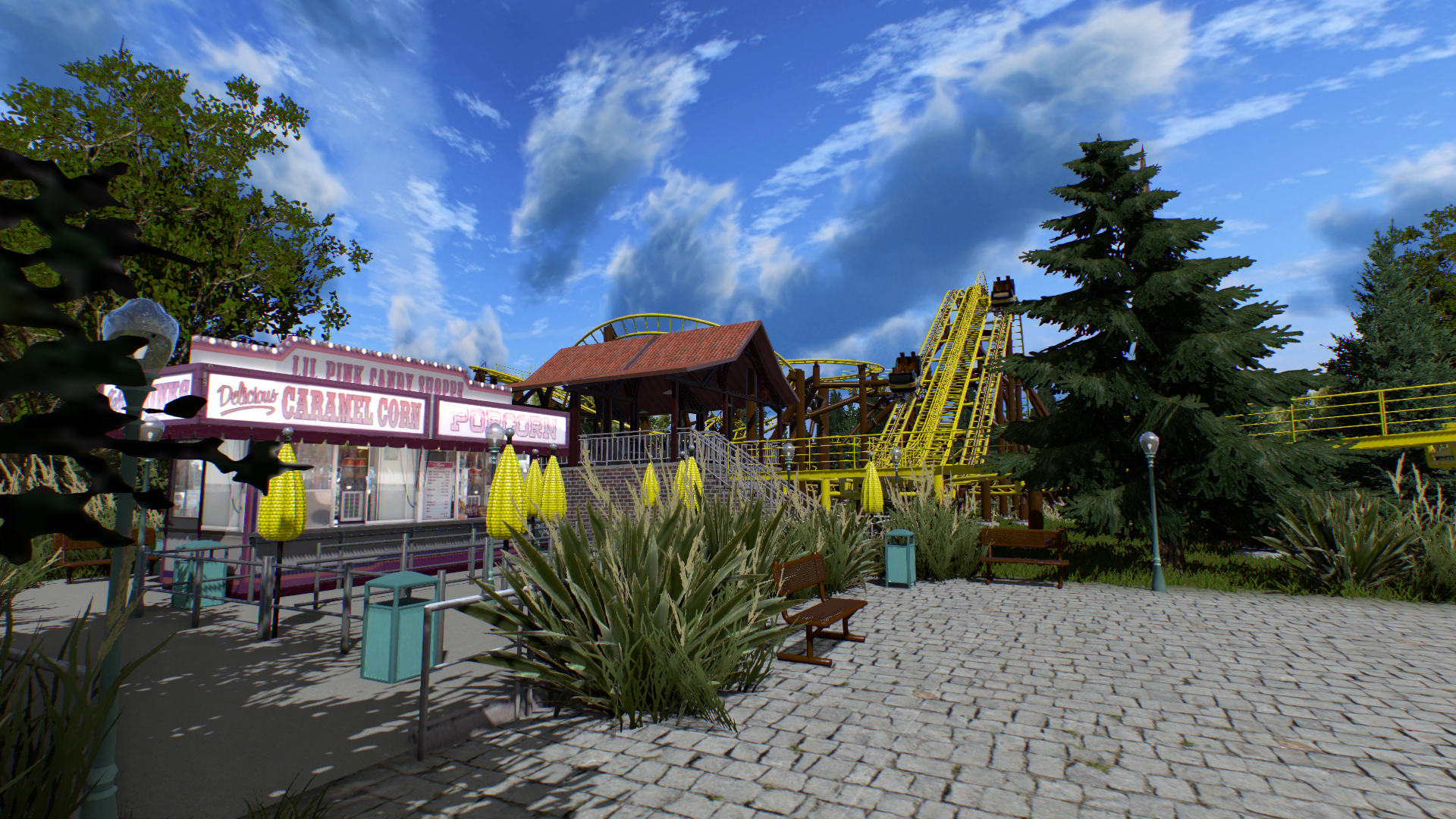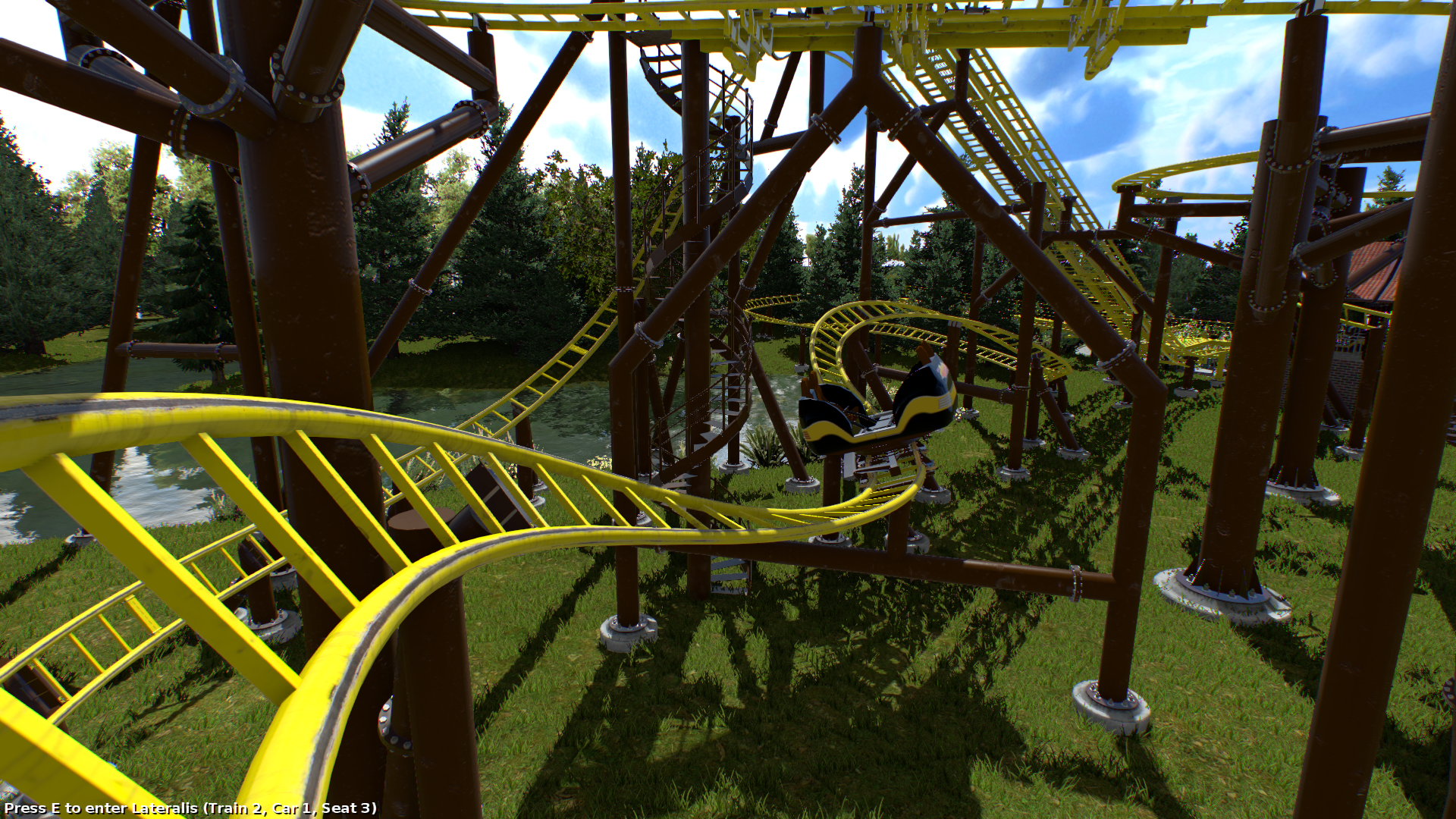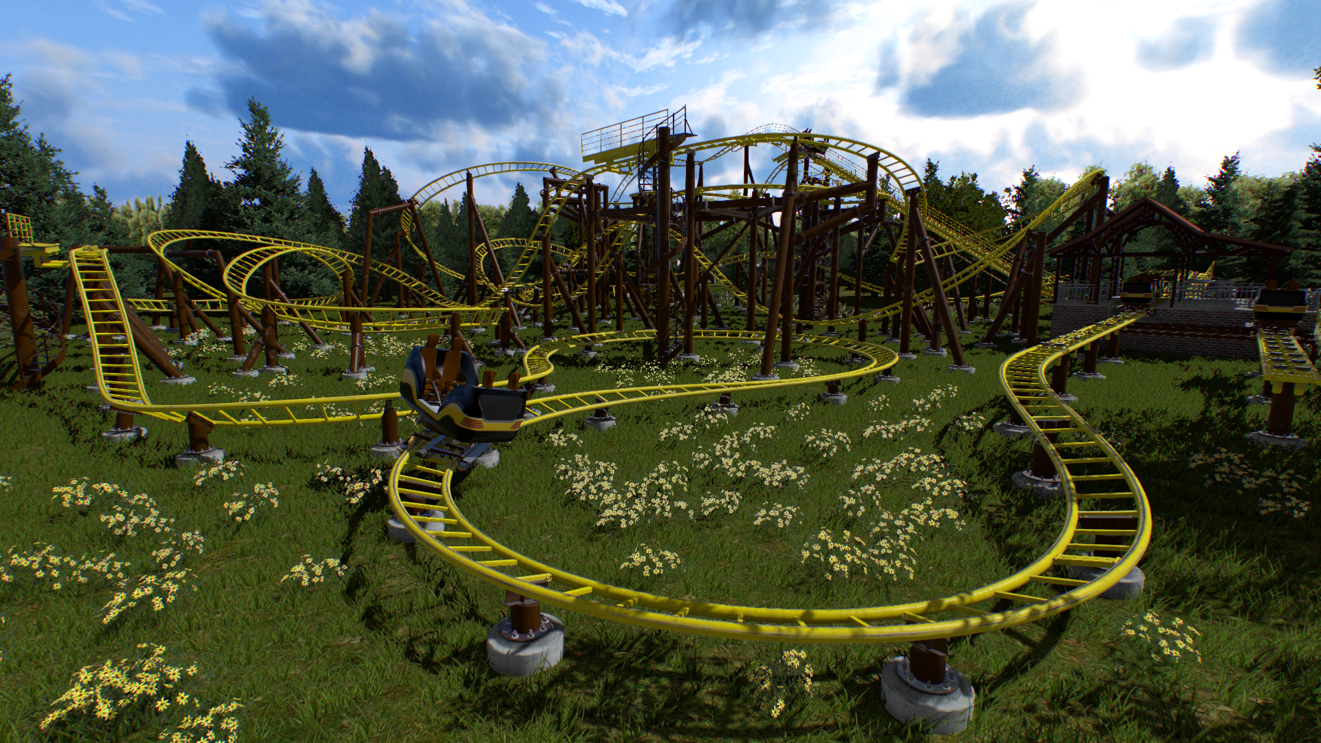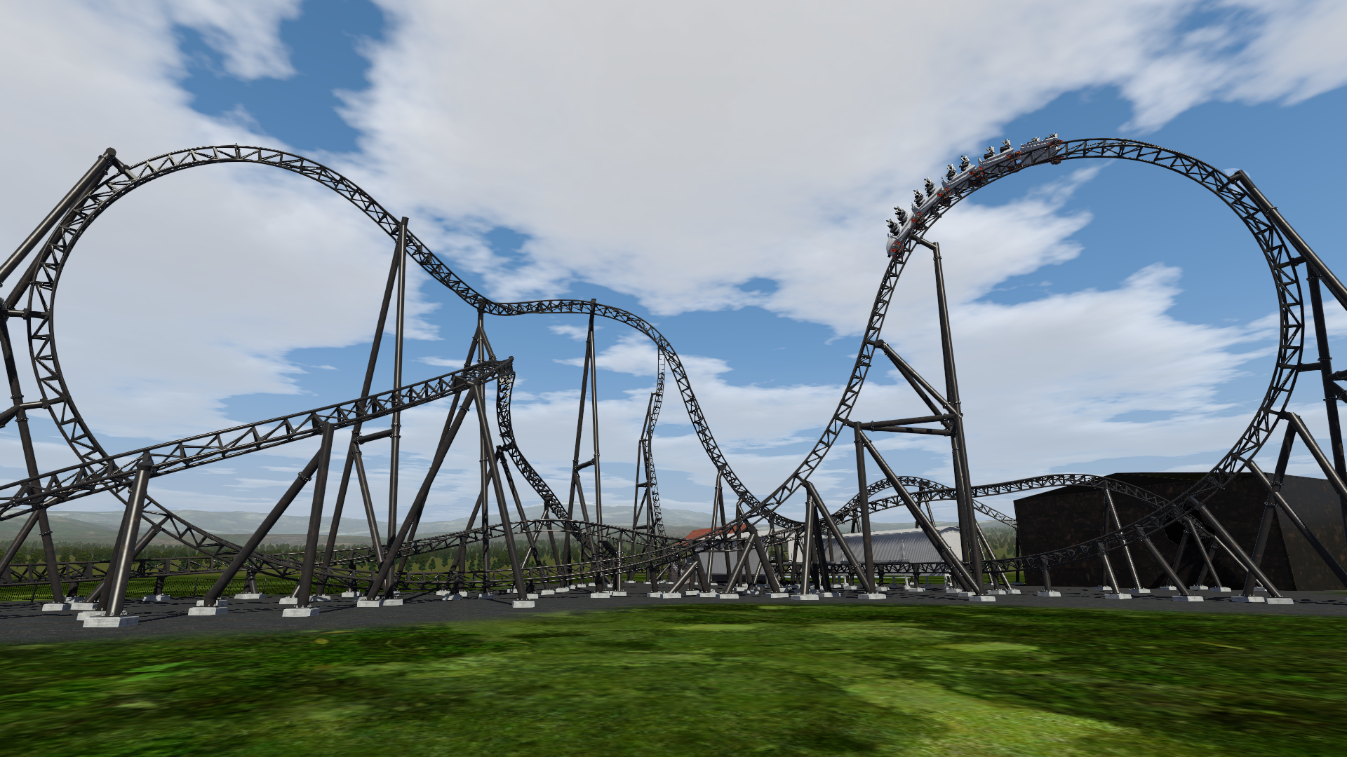 Ich wollte nen Spinning Coaster bauen, weil ich das glaube ich noch nie gemacht hatte. Zudem sollte es möglichst viel Strecke auf möglichst wenig Raum werden, was natürlich bei den Spinning-Wagen von Gerstlauer eine gewisse Herausforderung ist. Bis auf ein paar Grashalme und Catwalks, die man aber eh nicht erreichen kann, sollte das Lichtraumprofil jetzt überall passen. Auch wenn es vielleicht erst nicht so aussieht