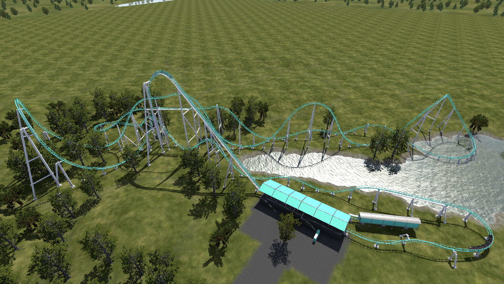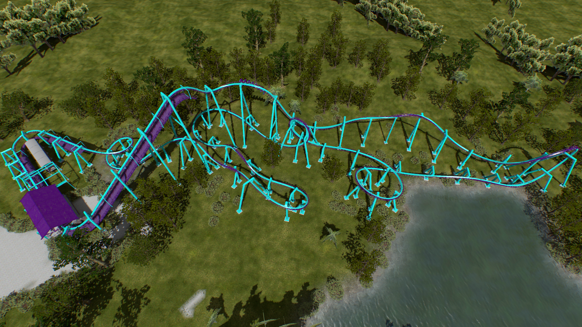 Ja genau, am Ende ist mir etwas die Geschwindigkeit ausgegangen, deshalb musste ich da sehr flach und dafür eher in die Breite bauen. Kurz kam dabei auch der Gedanke auf, dass man doch theoretisch alles bis auf den flachen Endteil und den Schlenker vorm zweiten Lift in eine Halle setzen könnte. Aber das hab ich dann schnell wieder verworfen