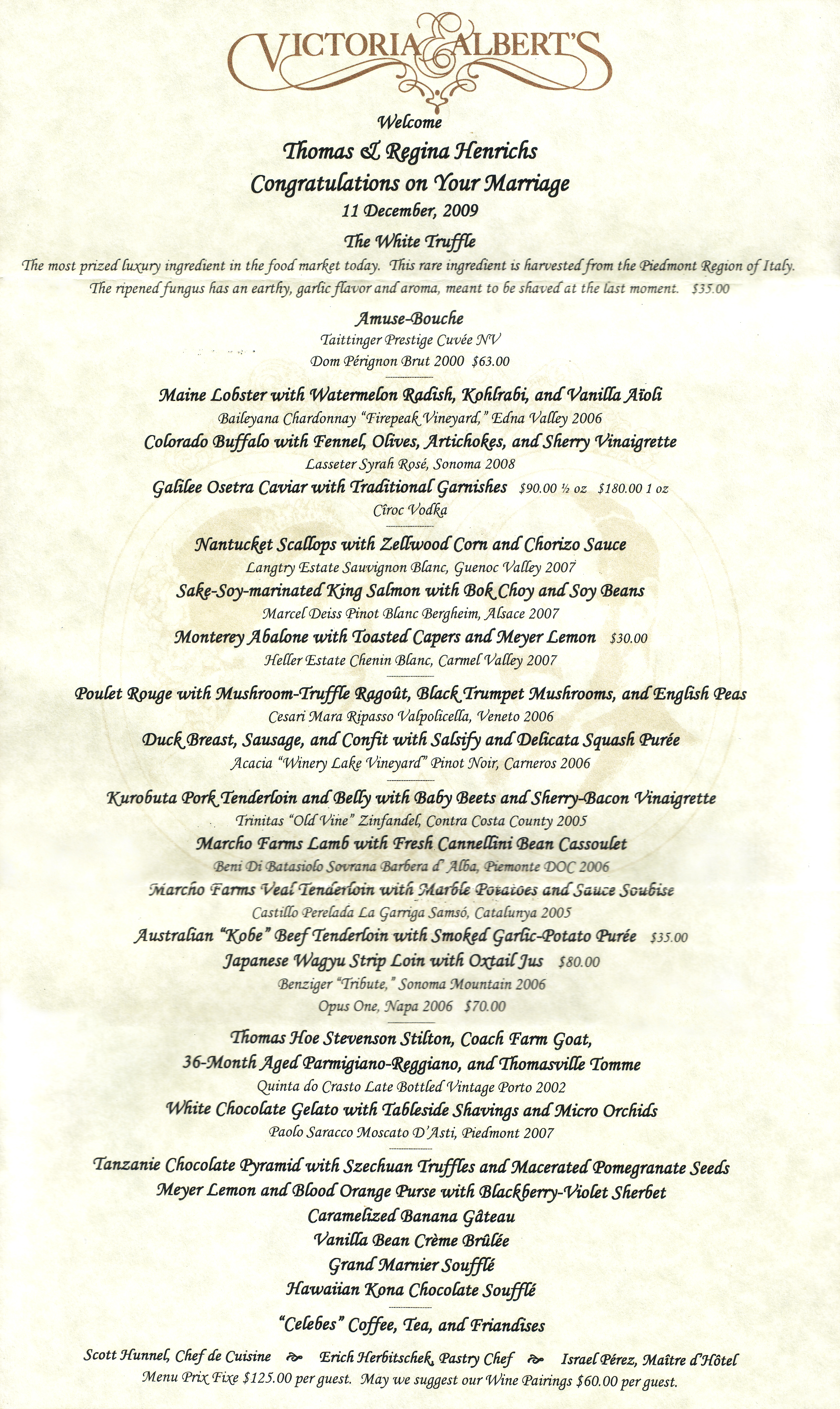 Ich habe gerade das Menü aus dem Victoria & Alberts gefunden. Das lag 2009 bei $185 incl. Wine Choice (6 amerikanisch eingeschenkte Gläser) plus Tax plus Gratuity. Übrigens keinesfalls ein „Tasting Menü“, eher Richtung Mr. Creosote.