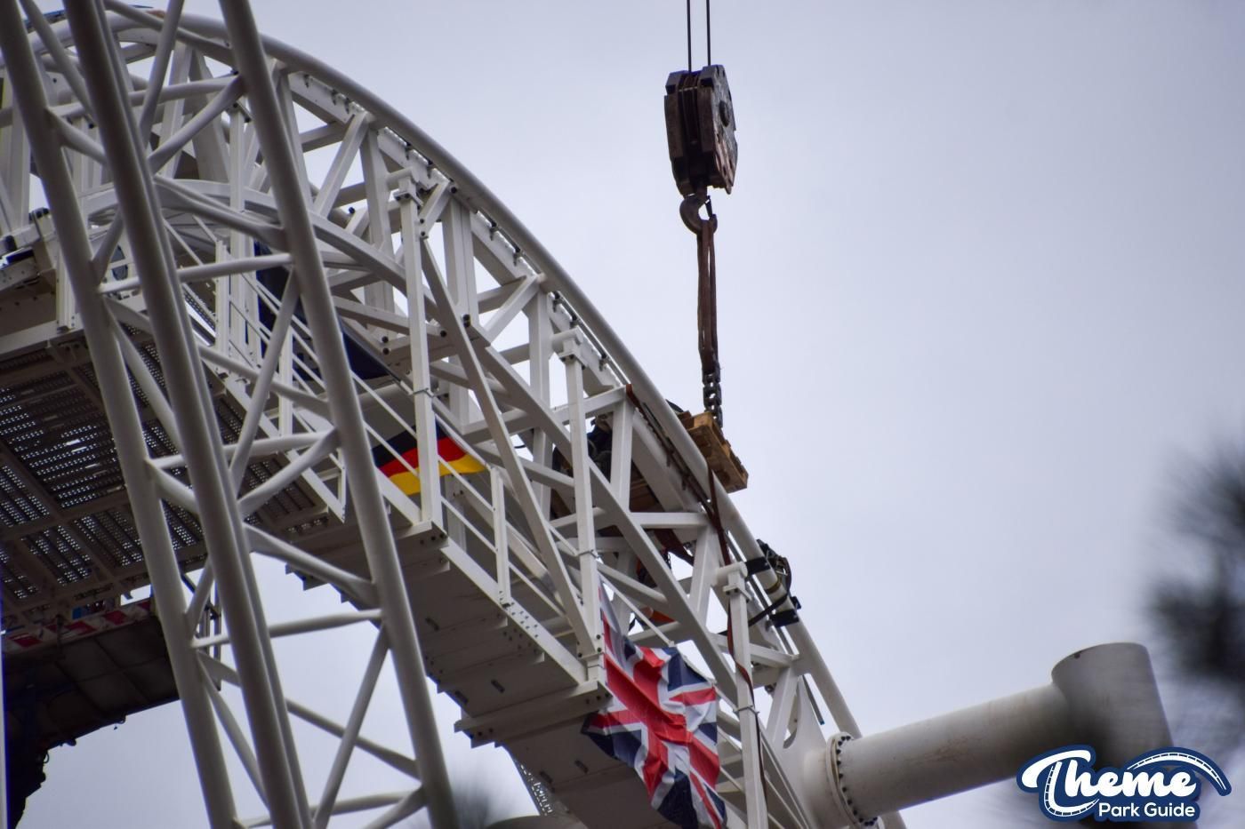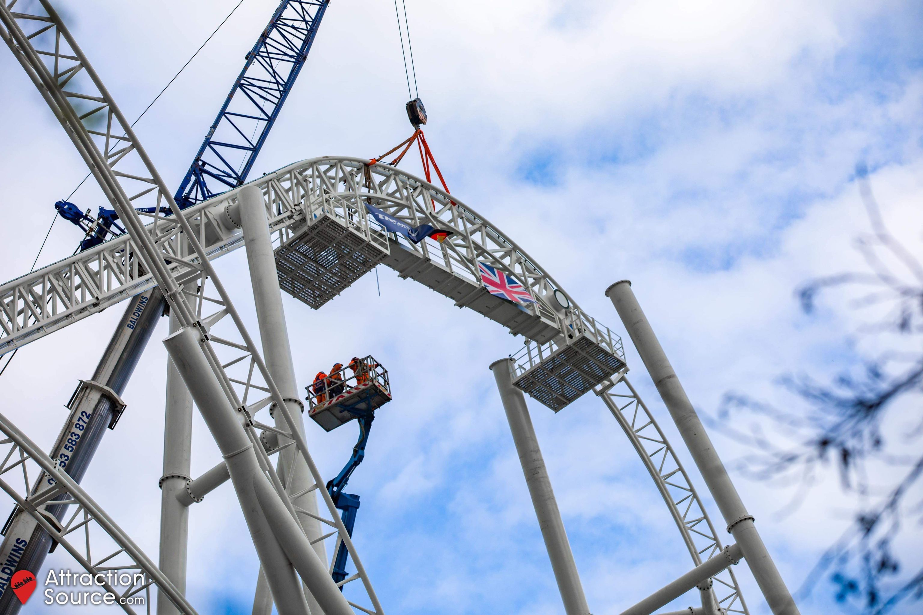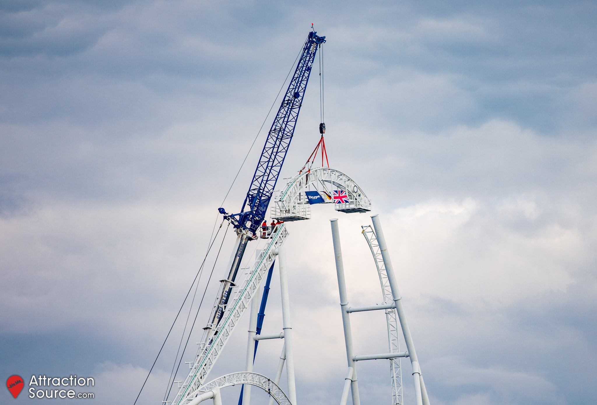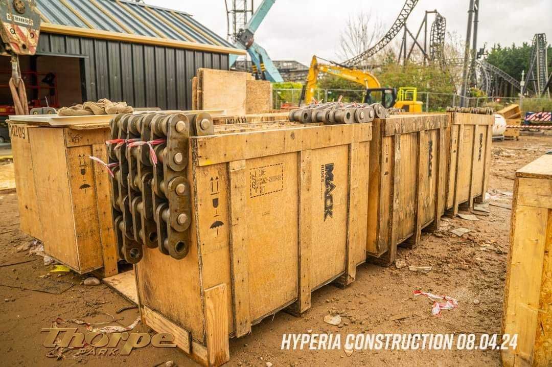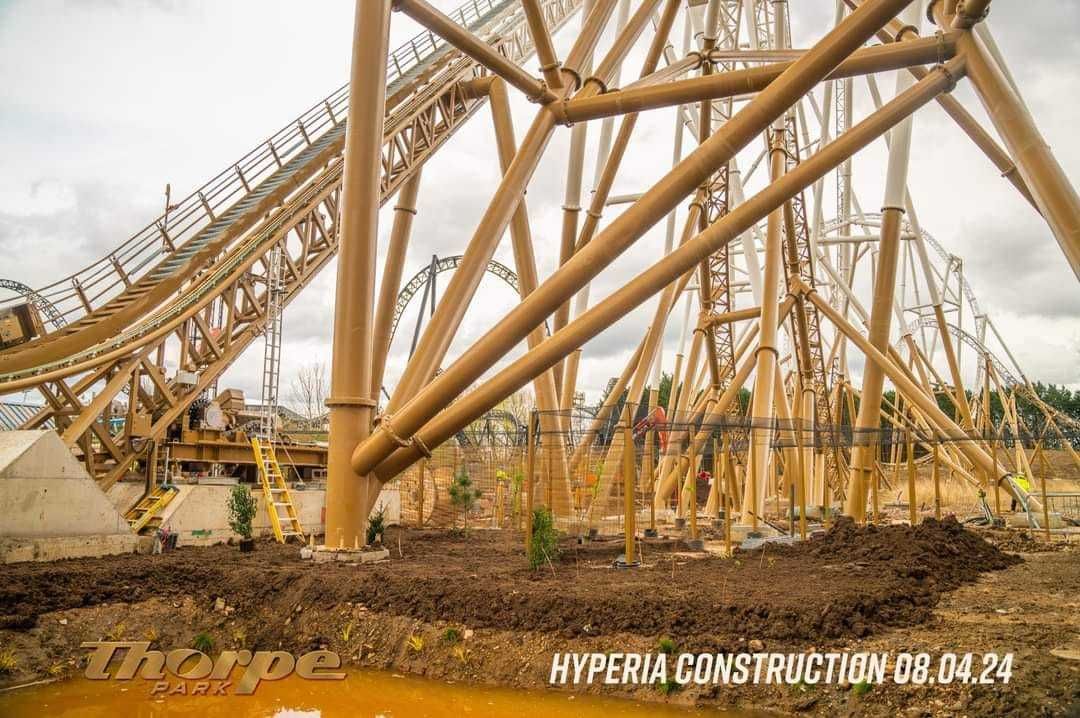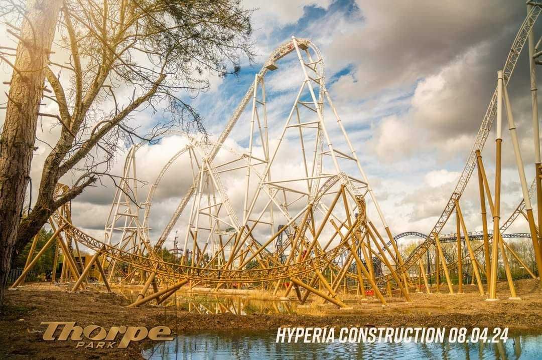 Attraction Source bei Facebook The top of Hyperia's lift hill is now in place, meaning the track of the UK's tallest and fastest roller coaster is complete! Adorned with the German and British flags, alongside the THORPE PARK Official logo, the coaster now stands the full 236ft tall!