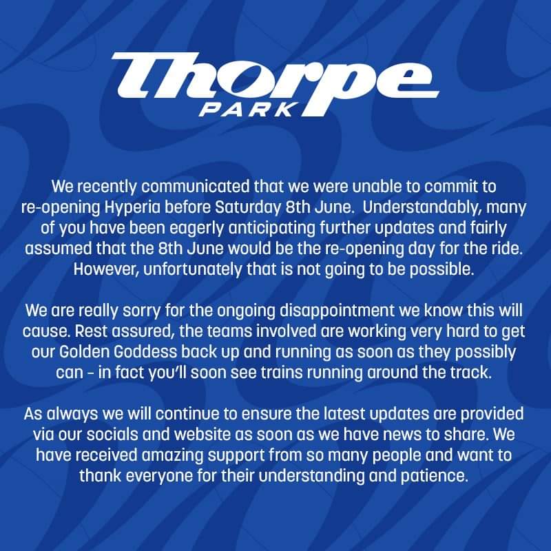 "Due to unforeseen circumstances Hyperia will not be opening on Saturday 25th May. The rest of the Park remains open. "