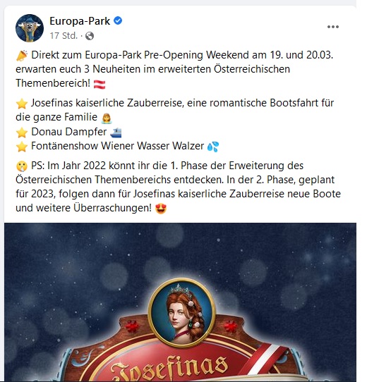 Ich bin gespannt, was dann wirklich neu sein wird, die Fontänenshow war ja bereits vorhanden, der Dampfer ist ebenfalls schon da - und es klingt so, als würde man 2022 mit Dschungelbooten durch das Kaiserreich fahren? Nach wirklich viel klingt das nicht, außer das jetzt alles Österreich zugeordnet wird, ich bin gespannt was das für Spices, Adventure Food Station und die Crocodile Bar bedeuten wird - hoffentlich gibts da dann Österreichisches Fast Food!