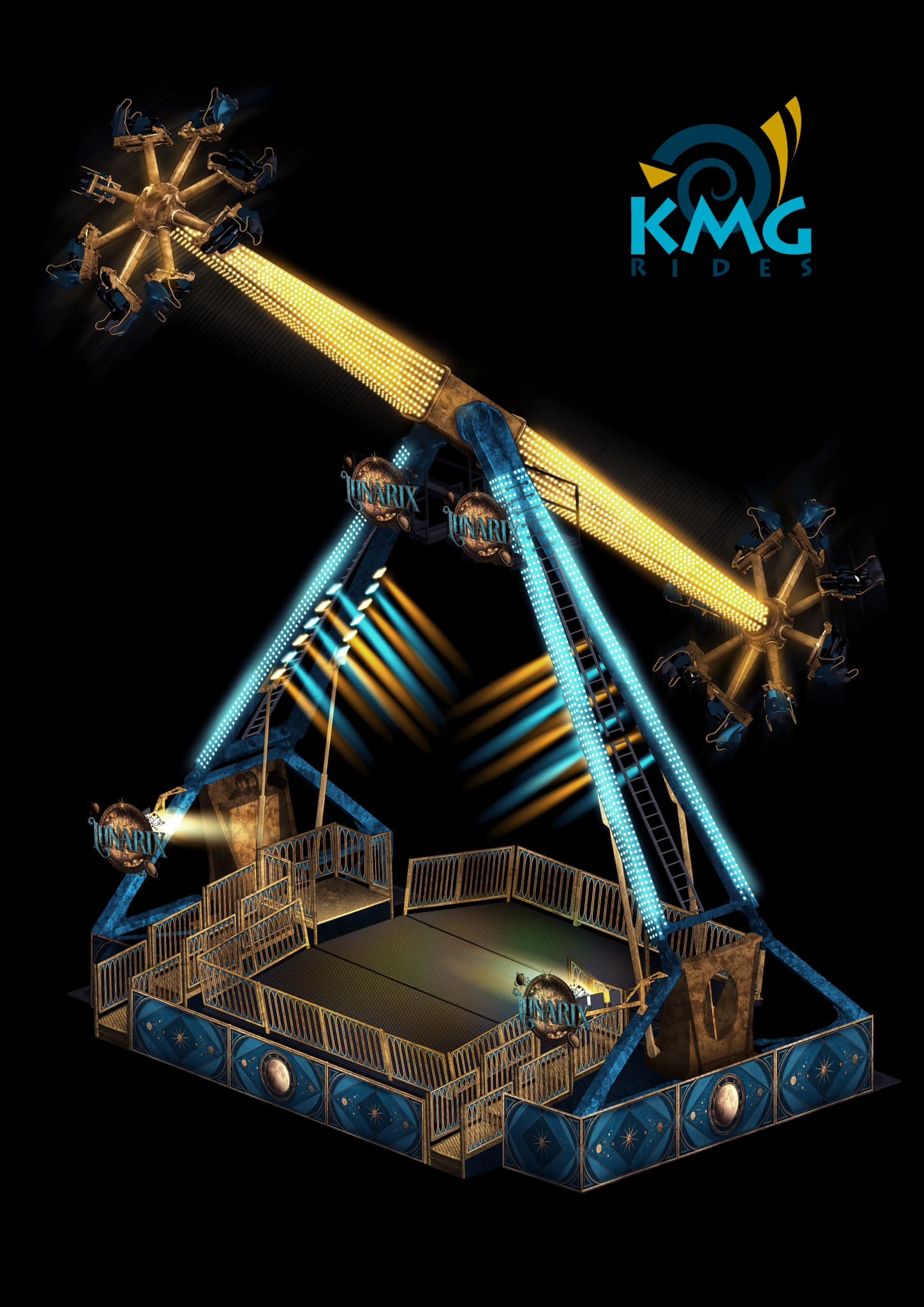 KMG introduced their new Lunarix ride last year, and sales are starting to pile up. The ride, a cross between an Inversion and Speed, reaches as high as 78'. It holds 16 riders at a time. The ride travels on one trailer and does not require a crane for set up. It takes about 4 hours to set up and does not require a water ballast tank. It travels on one road-legal trailer. The ride also comes with a full LED package.