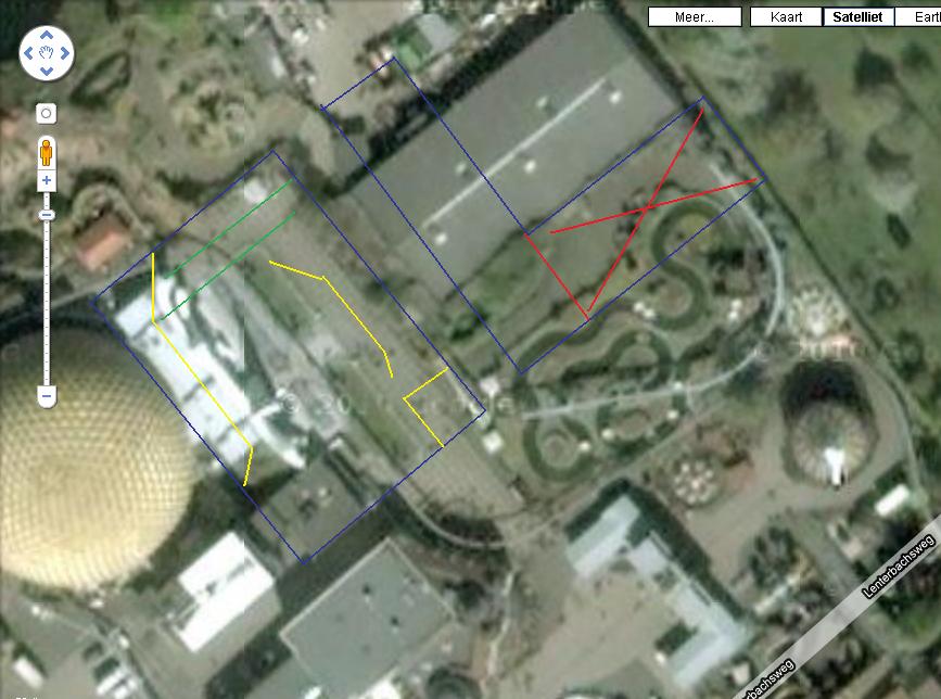 Auch das eben angesprochene verschiedene Nivau der Hallen ist Unwarscheinlich, da, das Abgeschrägte Gläserne nur eine Seite des Daches ist welches man auf dem Parkplan man sieht.