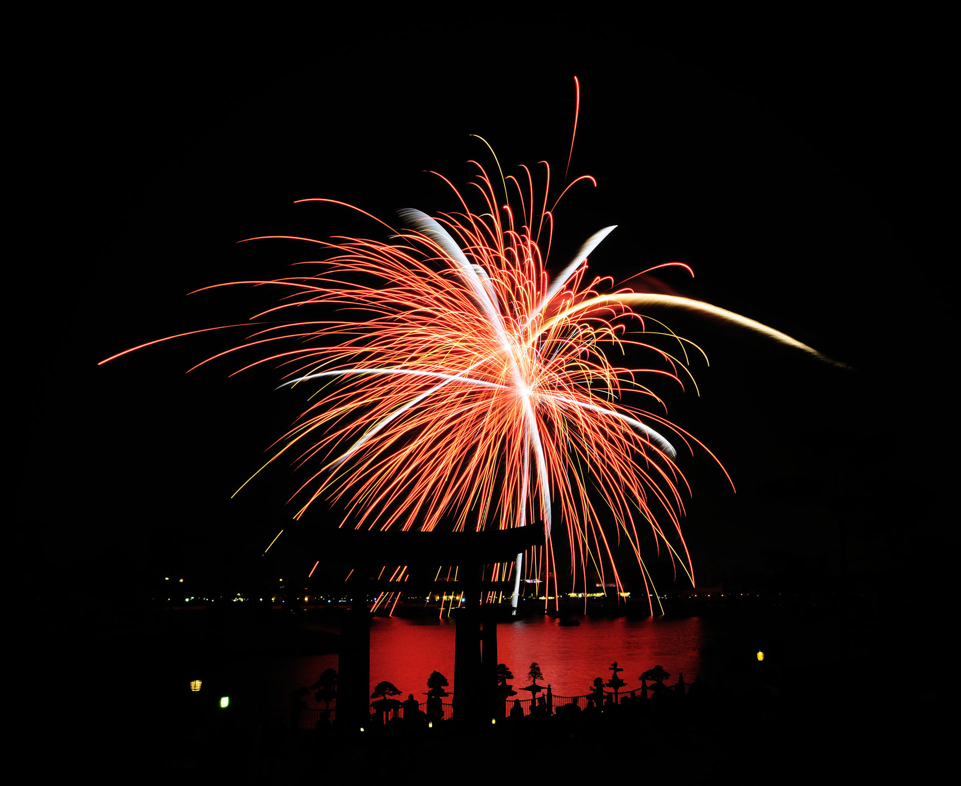 Entweder Totale (Itsukushima Tori leicht links vom Zentrum, unteres Drittel) oder Zoom (Tori links, untere zwei Drittel)