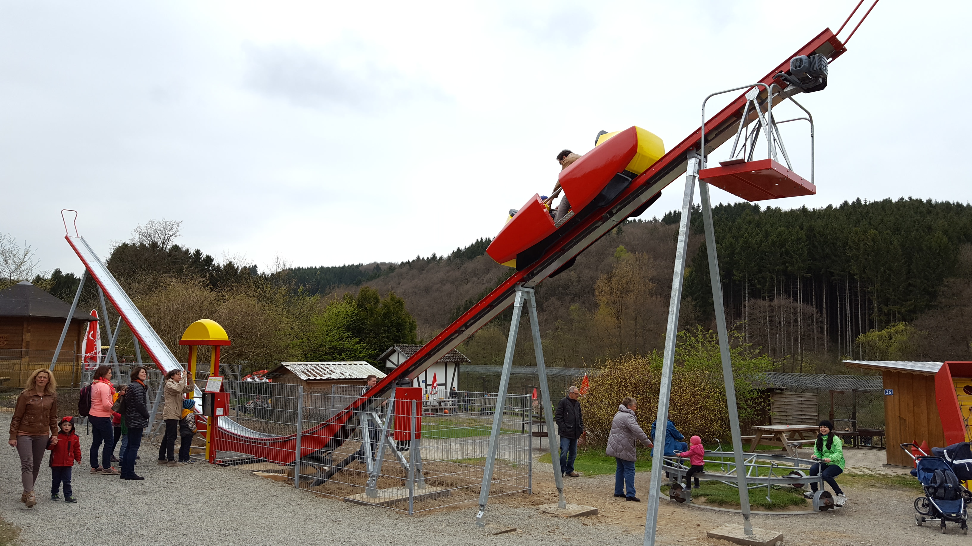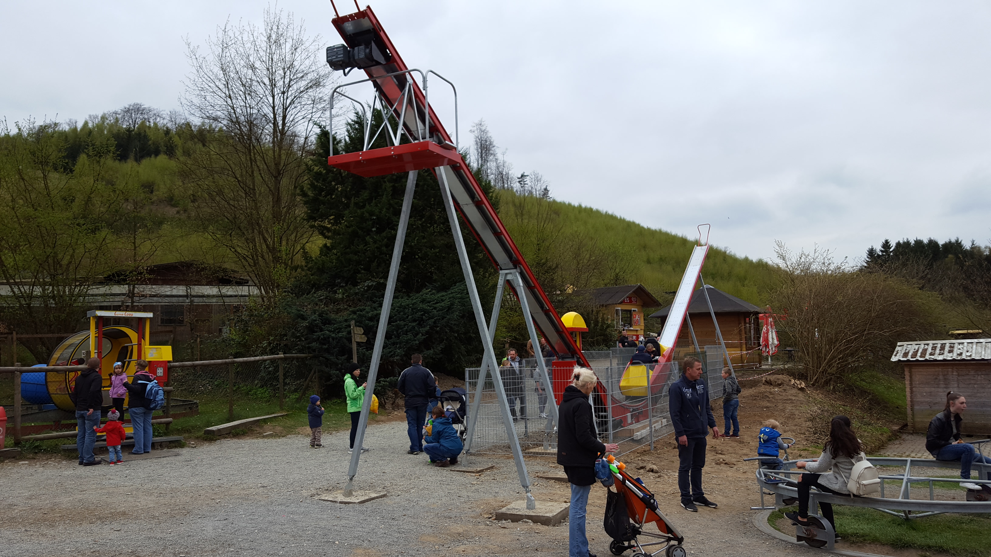 Der Wagen ist für eine Person bis 40 kg zugelassen. Er ist ebenfalls ein Eigenbau und verfügt über einen Safty Chain Dog. Es gibt zwei Lifte, aber ohne Motor sondern mit Seilen zum hinauf ziehen.