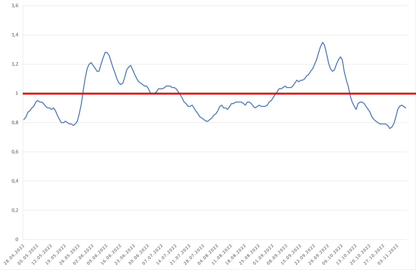 Insgesamt geben die Fundamentaldaten die Aufhebung der Isolation auch absolut her, die Herbstwelle ich bereits überschritten, der r(eff) seit Anfang Oktober wieder unter 1, die Infektionen also rückläufig.