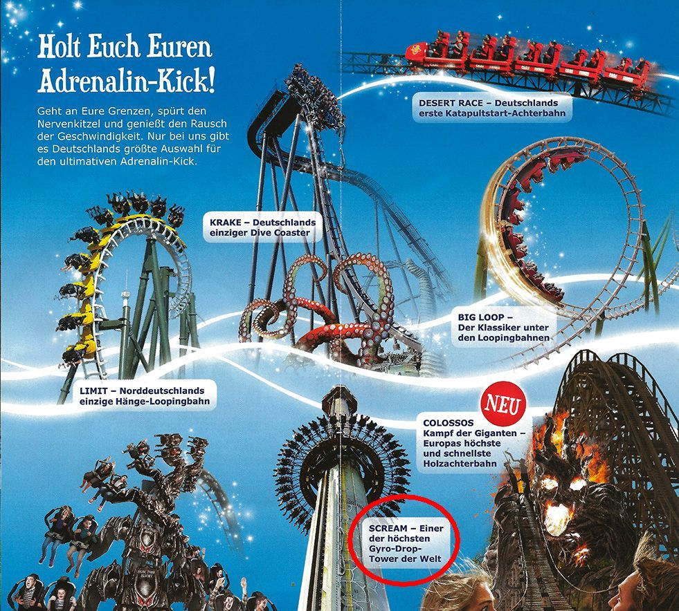 Im neuen Prospekt vom Heidepark wird Scream nur noch als "einer der höchsten Gyro-Drop-Tower der Welt" bezeichnet.