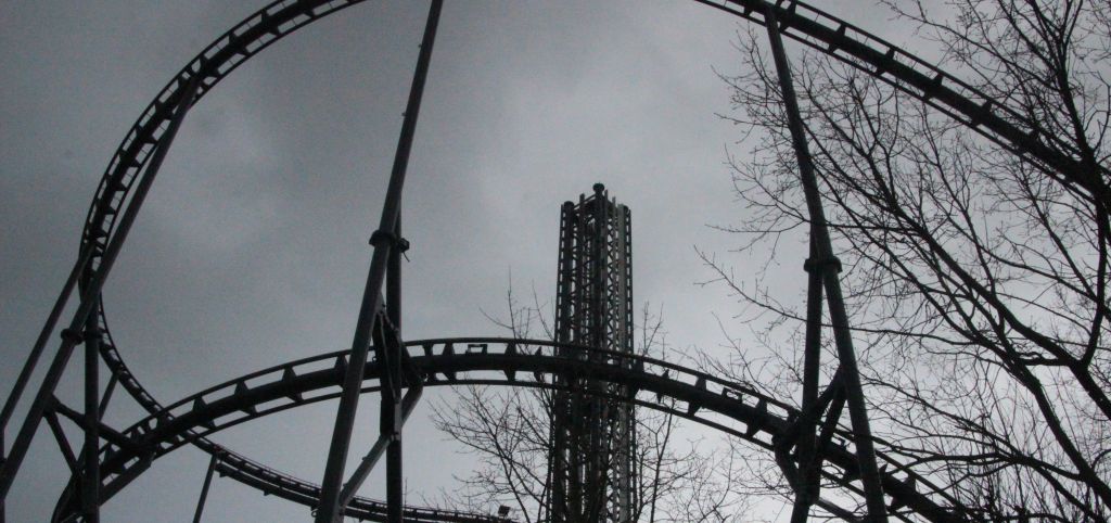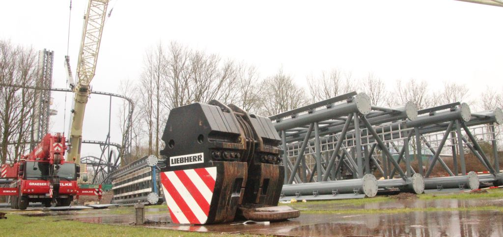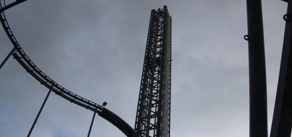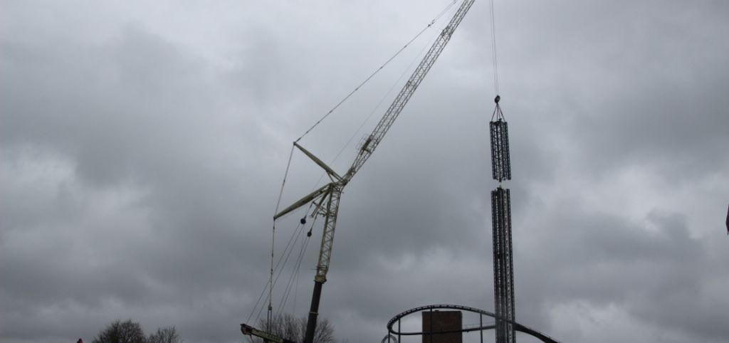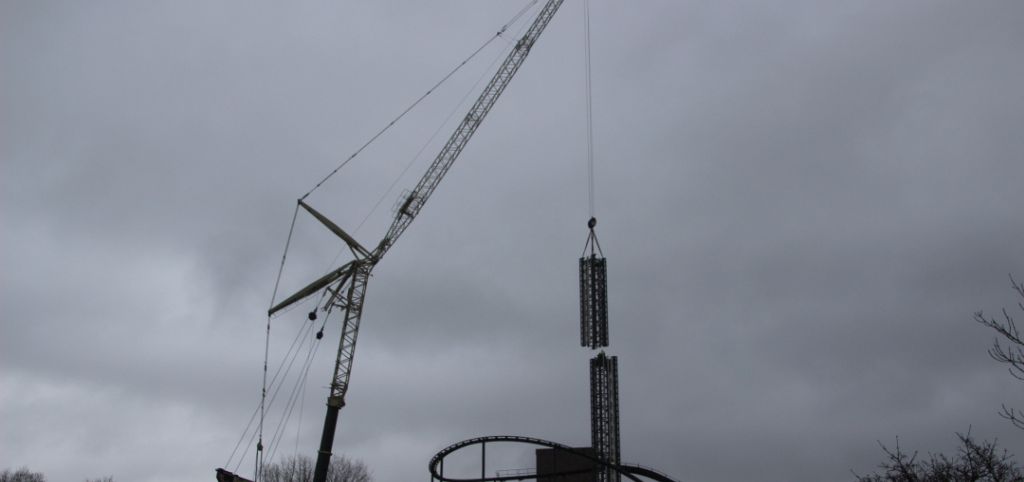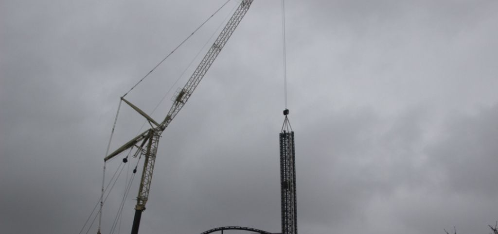 Läuft wohl auf fünf Turmsegmente mit Bremsen raus (drei aufgebaute, das noch liegende mit durchgehenden drei Bremsschwertreihen plus ein Element mit Reduzierung auf zwei und eine Reihe), also etwas über 50 Meter Bremslänge, was rund 50% der Fallstrecke bedeutet.