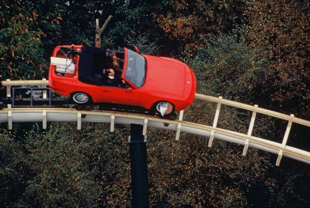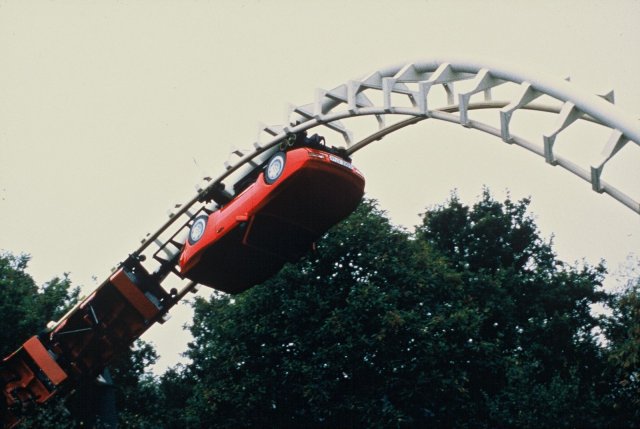 Hi war gerade dabei meine Photos zu sortieren und habe eine Dia reihe gefunden die ich für euch digitalisiert habe Diese zeigt eine vekoma Bahn mit einem sehr eigentümliche front Car dar die Bilder hier sicher noch keiner kennt zeig ich sie mahl sie sind aus einer Werbung der fa Porsche